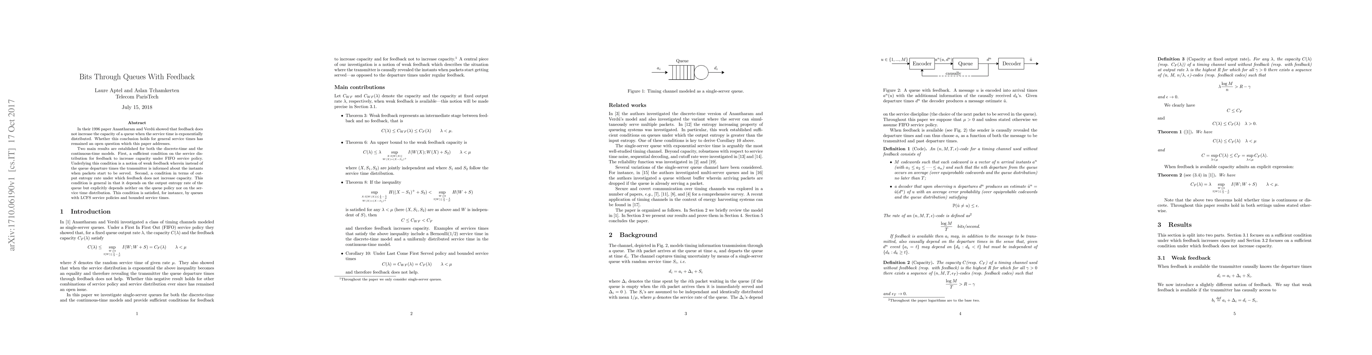 In their $1996$ paper Anantharam and Verd\'u showed that feedback does not increase the capacity of a queue when the service time is exponentially distributed. Whether this conclusion holds for general service times has remained an open question which this paper addresses. Two main results are established for both the discrete-time and the continuous-time models. First, a sufficient condition on the service distribution for feedback to increase capacity under FIFO service policy. Underlying this condition is a notion of weak feedback wherein instead of the queue departure times the transmitter is informed about the instants when packets start to be served. Second, a condition in terms of output entropy rate under which feedback does not increase capacity. This condition is general in that it depends on the output entropy rate of the queue but explicitly depends neither on the queue policy nor on the service time distribution. This condition is satisfied, for instance, by queues with LCFS service policies and bounded service times.