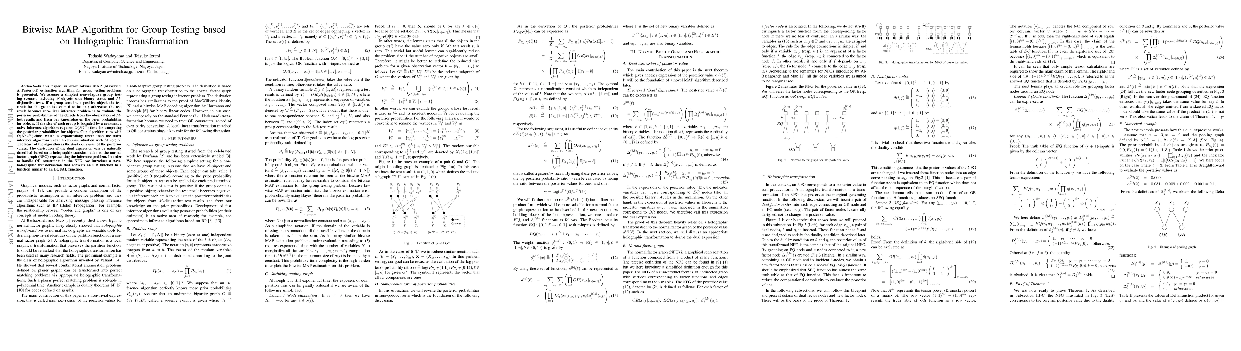 In this paper, an exact bitwise MAP (Maximum A Posteriori) estimation algorithm for group testing problems is presented. We assume a simplest non-adaptive group testing scenario including N-objects with binary status and M-disjunctive tests. If a group contains a positive object, the test result for the group is assumed to be one; otherwise, the test result becomes zero. Our inference problem is to evaluate the posterior probabilities of the objects from the observation of M-test results and from our knowledge on the prior probabilities for objects. The heart of the algorithm is the dual expression of the posterior values. The derivation of the dual expression can be naturally described based on a holographic transformation to the normal factor graph (NFG) representing the inference problem.