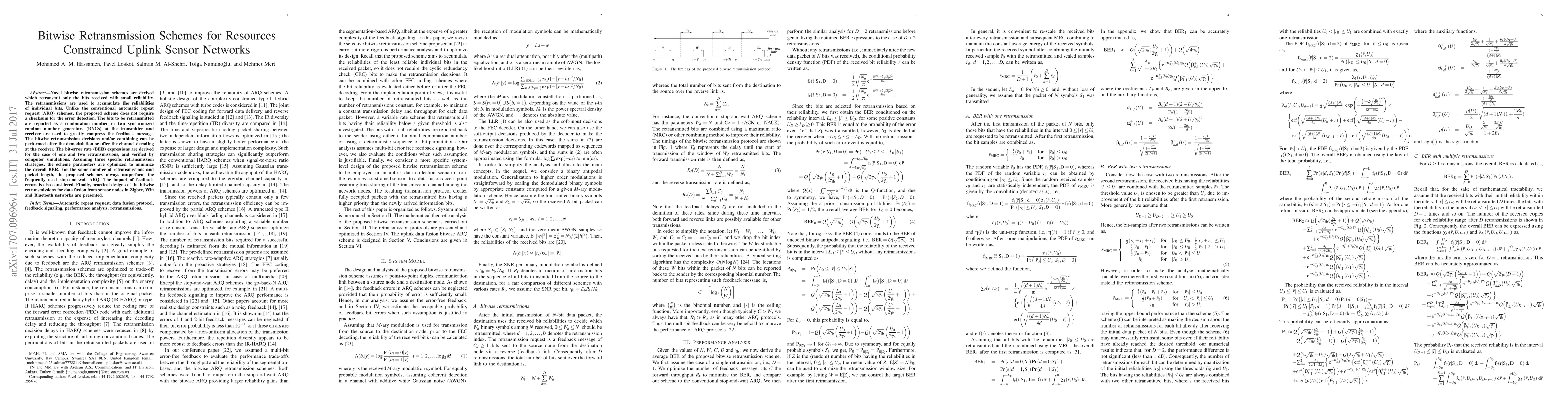 This paper proposes novel bitwise retransmission schemes for resource-constrained uplink sensor networks that retransmit only unreliable bits, optimizing bit-error rate (BER) without requiring checksums. The schemes outperform traditional stop-and-wait ARQ methods and are designed for practical implementation in Zigbee, Wifi, and Bluetooth networks.