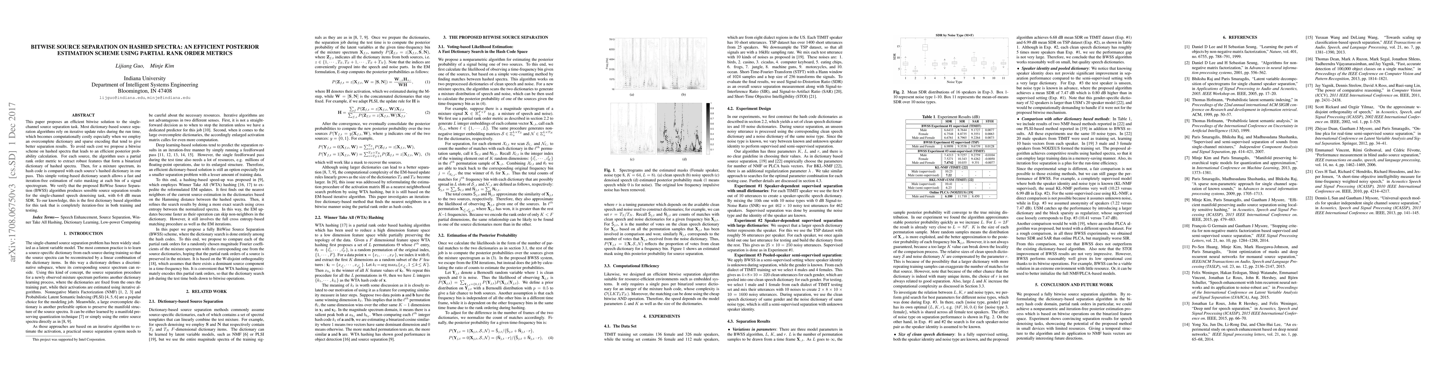 This paper introduces BitWise Source Separation (BWSS), an iteration-free algorithm for single-channel source separation using hashed spectra and partial rank order metrics. It achieves efficient posterior probability calculation, providing 6-8 dB mean SDR in speech denoising tasks without iterative updates during training or testing.