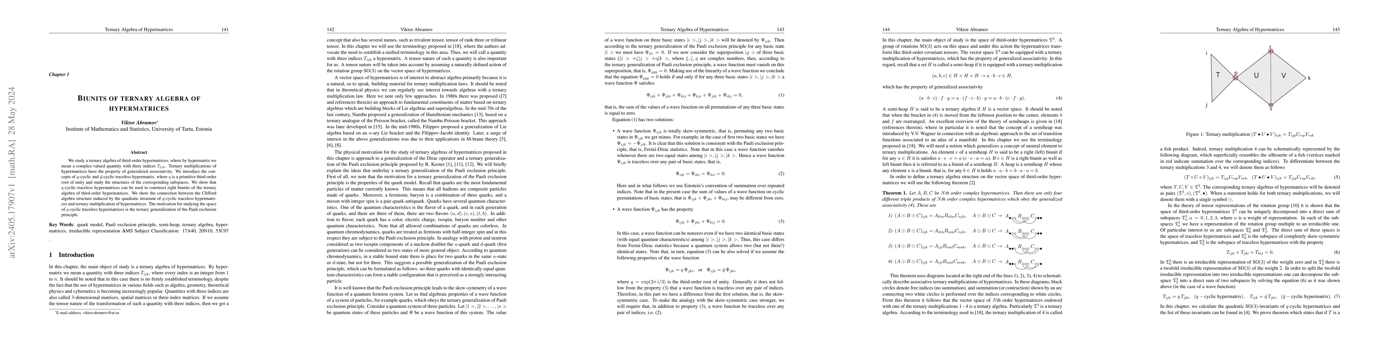 This paper investigates ternary algebras of third-order hypermatrices, exploring two ternary multiplications with generalized associativity and the geometric meaning of their invariants. It proves that a specific 10-dimensional subspace, representing the weight 2 tensor representation, contains right biunits, motivated by a ternary generalization of the Pauli exclusion principle.