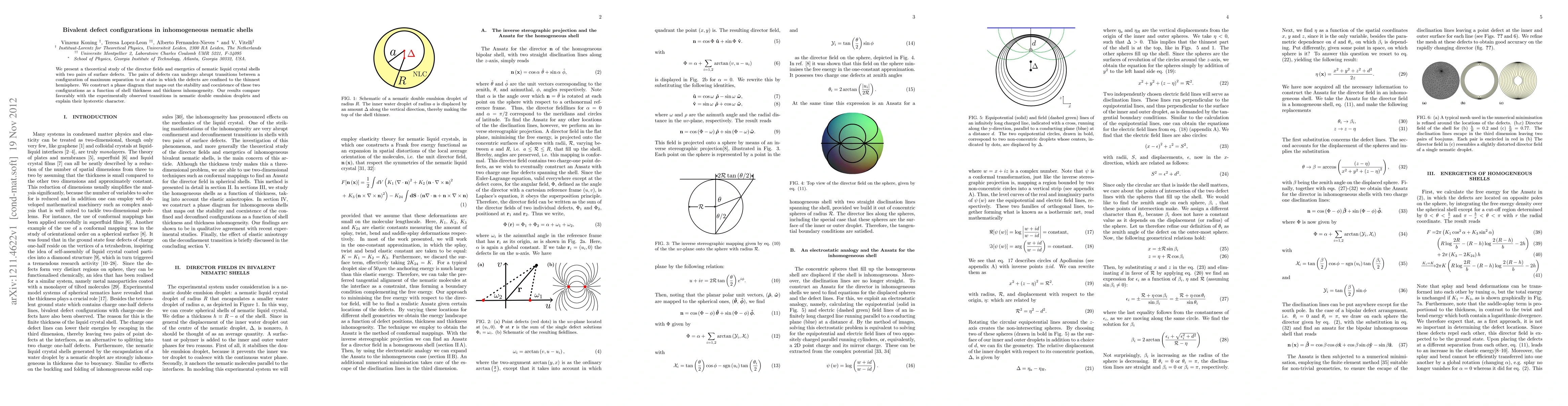 This paper investigates the director fields and energetics of nematic liquid crystal shells with two pairs of surface defects, revealing transitions between configurations of maximum defect separation and confinement. A phase diagram is developed to map the stability and coexistence of these configurations relative to shell thickness and inhomogeneity, aligning well with experimental observations in nematic double emulsion droplets.