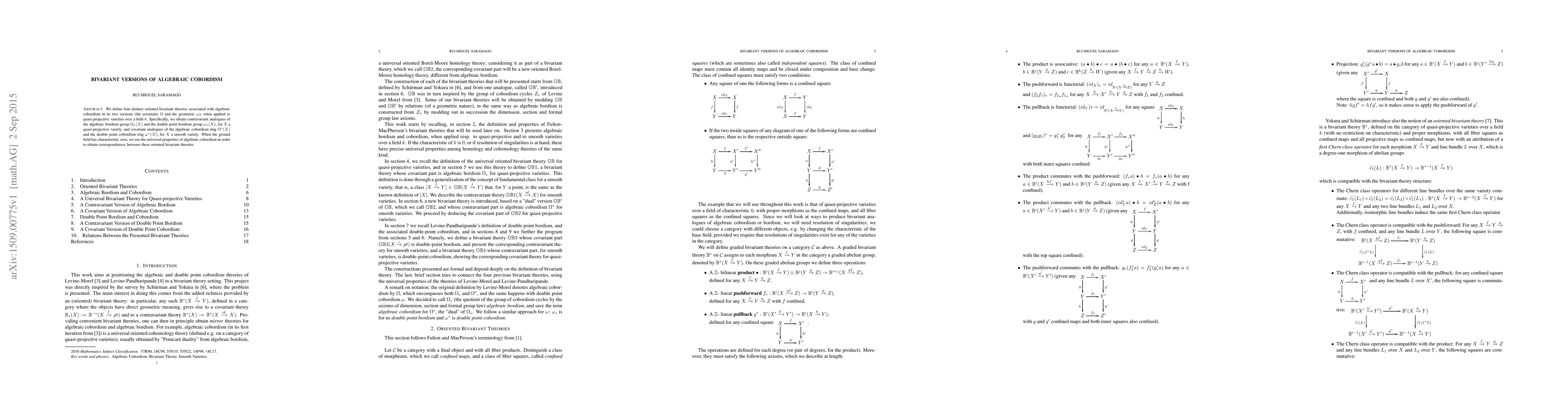 This paper defines four bivariant theories linked to algebraic cobordism, distinguishing between axiomatic and geometric versions, and applies them to quasi-projective varieties over a field $k$. It establishes contravariant and covariant analogues of algebraic and double point bordism groups and rings, and demonstrates correspondences when the field has characteristic zero.