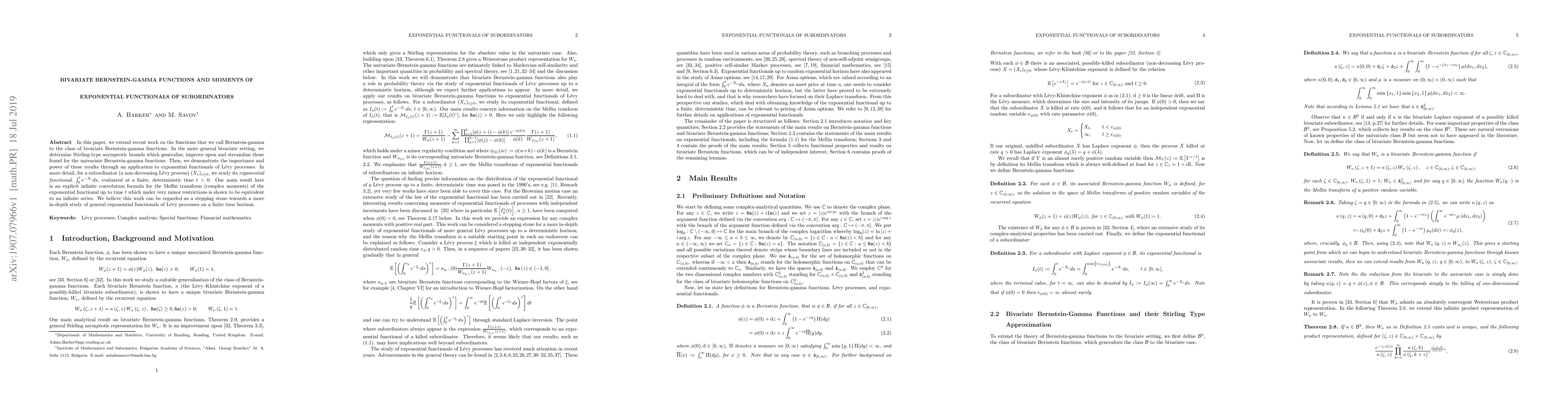In this paper, we extend recent work on the functions that we call Bernstein-gamma to the class of bivariate Bernstein-gamma functions. In the more general bivariate setting, we determine Stirling-type asymptotic bounds which generalise, improve upon and streamline those found for the univariate Bernstein-gamma functions. Then, we demonstrate the importance and power of these results through an application to exponential functionals of L\'evy processes. In more detail, for a subordinator (a non-decreasing L\'evy process) $(X_s)_{s\geq 0}$, we study its \textit{exponential functional}, $\int_0^t e^{-X_s}ds $, evaluated at a finite, deterministic time $t>0$. Our main result here is an explicit infinite convolution formula for the Mellin transform (complex moments) of the exponential functional up to time $t$ which under very minor restrictions is shown to be equivalent to an infinite series. We believe this work can be regarded as a stepping stone towards a more in-depth study of general exponential functionals of L\'evy processes on a finite time horizon.