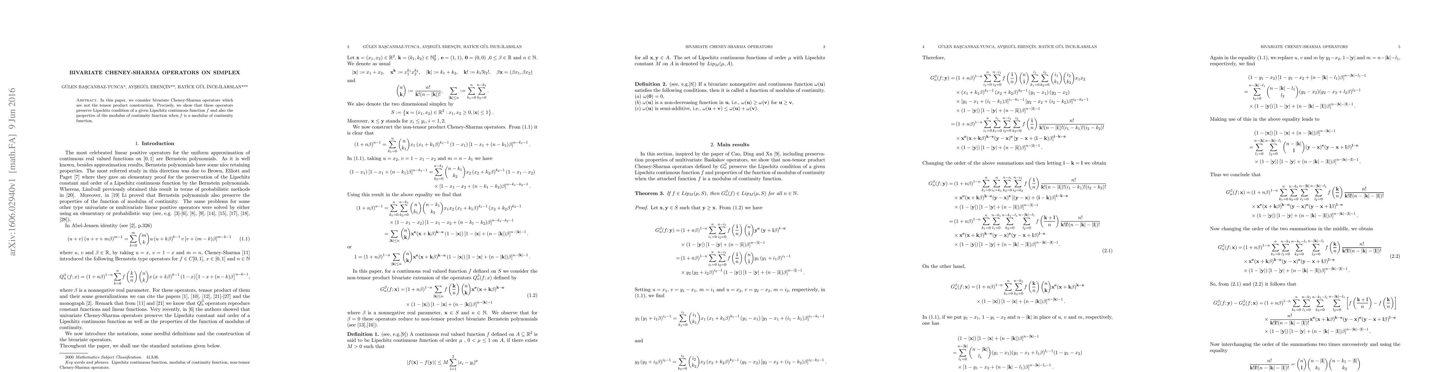 Summary: This paper introduces bivariate Cheney-Sharma operators that do not rely on tensor product construction. It demonstrates that these operators maintain the Lipschitz condition and properties of the modulus of continuity for relevant functions.