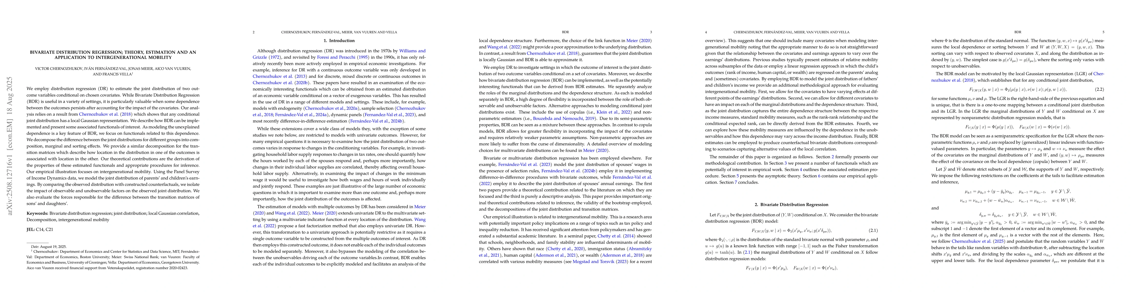 We employ distribution regression (DR) to estimate the joint distribution of two outcome variables conditional on chosen covariates. While Bivariate Distribution Regression (BDR) is useful in a variety of settings, it is particularly valuable when some dependence between the outcomes persists after accounting for the impact of the covariates. Our analysis relies on a result from Chernozhukov et al. (2018) which shows that any conditional joint distribution has a local Gaussian representation. We describe how BDR can be implemented and present some associated functionals of interest. As modeling the unexplained dependence is a key feature of BDR, we focus on functionals related to this dependence. We decompose the difference between the joint distributions for different groups into composition, marginal and sorting effects. We provide a similar decomposition for the transition matrices which describe how location in the distribution in one of the outcomes is associated with location in the other. Our theoretical contributions are the derivation of the properties of these estimated functionals and appropriate procedures for inference. Our empirical illustration focuses on intergenerational mobility. Using the Panel Survey of Income Dynamics data, we model the joint distribution of parents' and children's earnings. By comparing the observed distribution with constructed counterfactuals, we isolate the impact of observable and unobservable factors on the observed joint distribution. We also evaluate the forces responsible for the difference between the transition matrices of sons' and daughters'.
