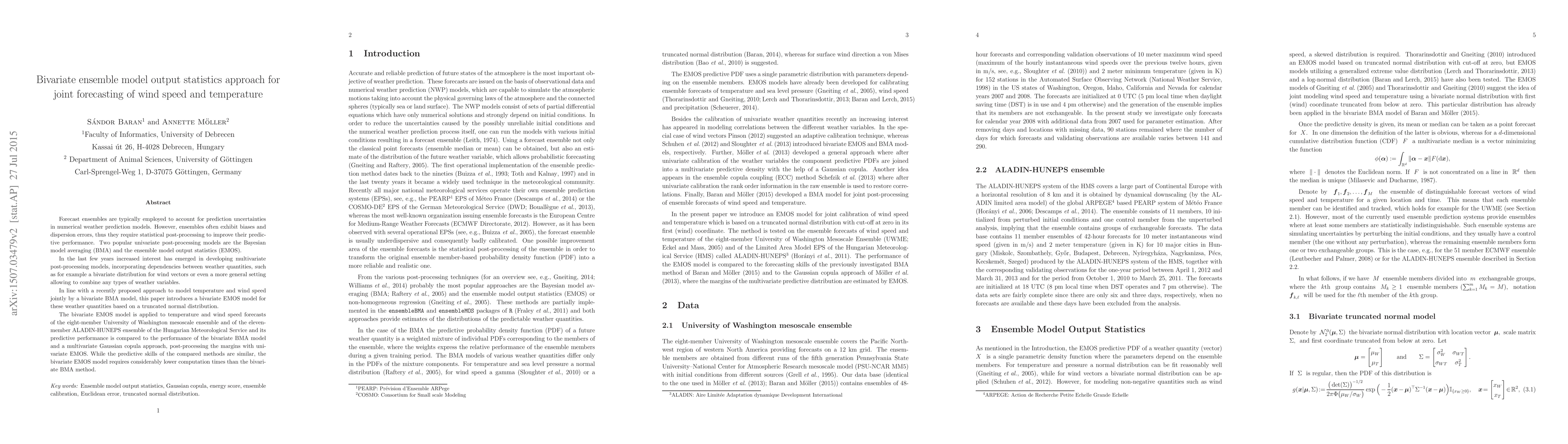 This paper introduces a bivariate ensemble model output statistics (EMOS) approach to jointly forecast wind speed and temperature, utilizing a truncated normal distribution. The method is compared to bivariate Bayesian model averaging (BMA) and a multivariate Gaussian copula approach, showing similar predictive performance but significantly lower computational costs.