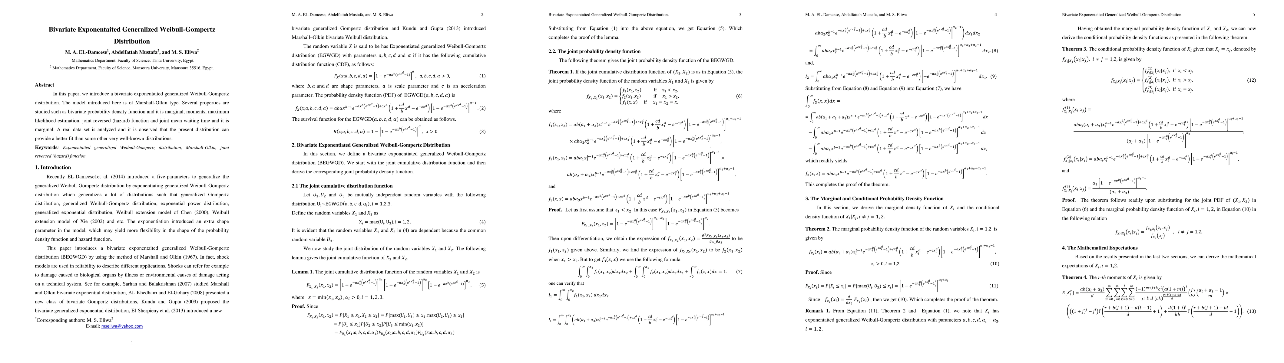 This paper introduces a Marshall-Olkin type bivariate exponentiated generalized Weibull-Gompertz distribution, studying its properties including probability density function, marginal distributions, moments, and maximum likelihood estimation. The proposed model is shown to fit real data better than other established distributions.