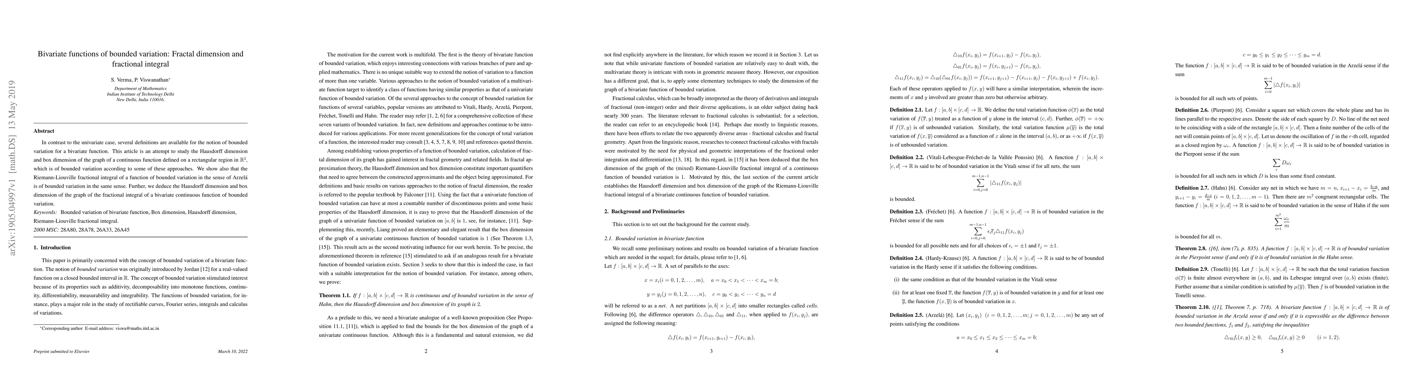 This paper explores the Hausdorff and box dimensions of the graph of a bivariate continuous function of bounded variation, comparing different definitions of bounded variation. It also investigates the bounded variation properties of the Riemann-Liouville fractional integral of such functions and deduces their respective Hausdorff and box dimensions.