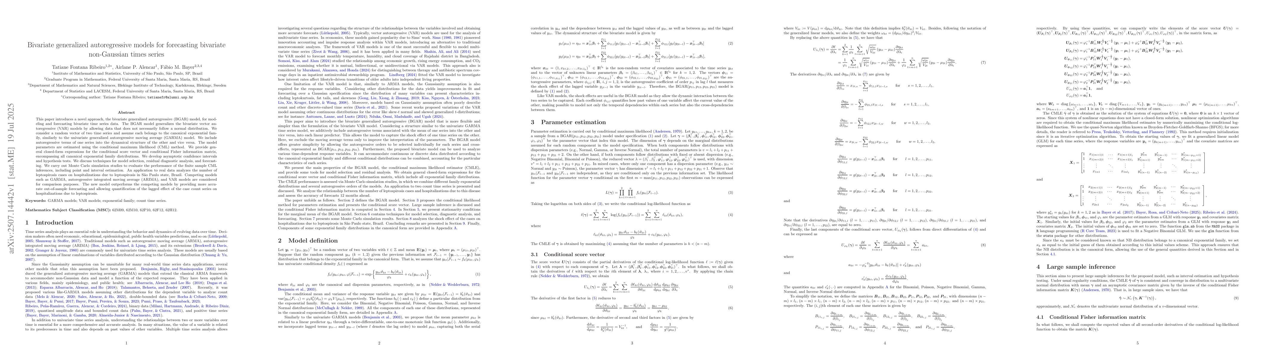 This paper introduces a novel approach, the bivariate generalized autoregressive (BGAR) model, for modeling and forecasting bivariate time series data. The BGAR model generalizes the bivariate vector autoregressive (VAR) models by allowing data that does not necessarily follow a normal distribution. We consider a random vector of two time series and assume each belongs to the canonical exponential family, similarly to the univariate generalized autoregressive moving average (GARMA) model. We include autoregressive terms of one series into the dynamical structure of the other and vice versa. The model parameters are estimated using the conditional maximum likelihood (CML) method. We provide general closed-form expressions for the conditional score vector and conditional Fisher information matrix, encompassing all canonical exponential family distributions. We develop asymptotic confidence intervals and hypothesis tests. We discuss techniques for model selection, residual diagnostic analysis, and forecasting. We carry out Monte Carlo simulation studies to evaluate the performance of the finite sample CML inferences, including point and interval estimation. An application to real data analyzes the number of leptospirosis cases on hospitalizations due to leptospirosis in S\~ao Paulo state, Brazil. Competing models such as GARMA, autoregressive integrated moving average (ARIMA), and VAR models are considered for comparison purposes. The new model outperforms the competing models by providing more accurate out-of-sample forecasting and allowing quantification of the lagged effect of the case count series on hospitalizations due to leptospirosis.