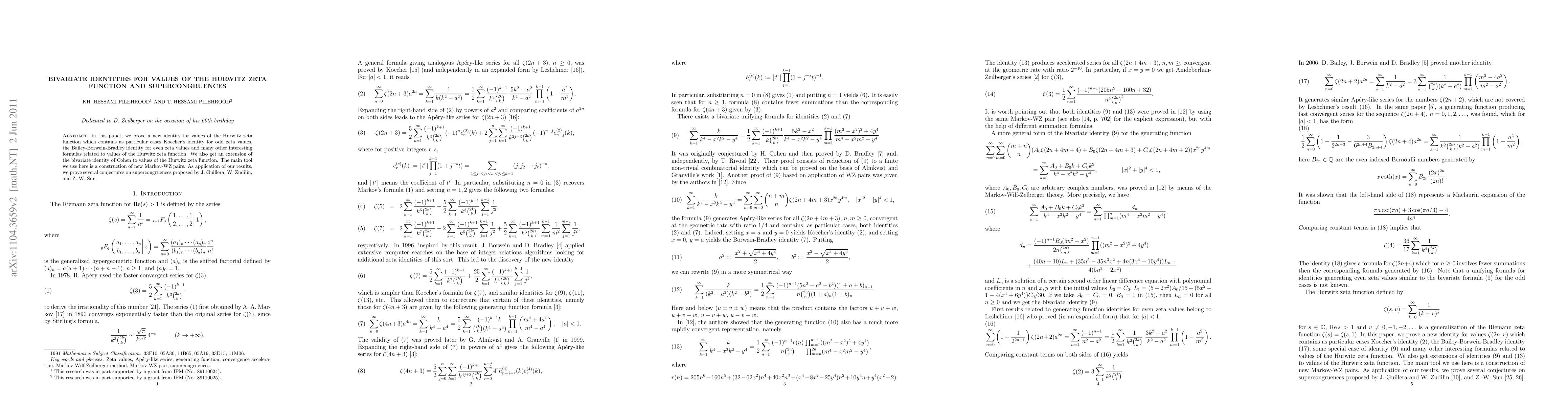 Researchers prove a new identity for values of the Hurwitz zeta function, relating it to various known formulas and extending an existing bivariate identity, with applications to supercongruences.
