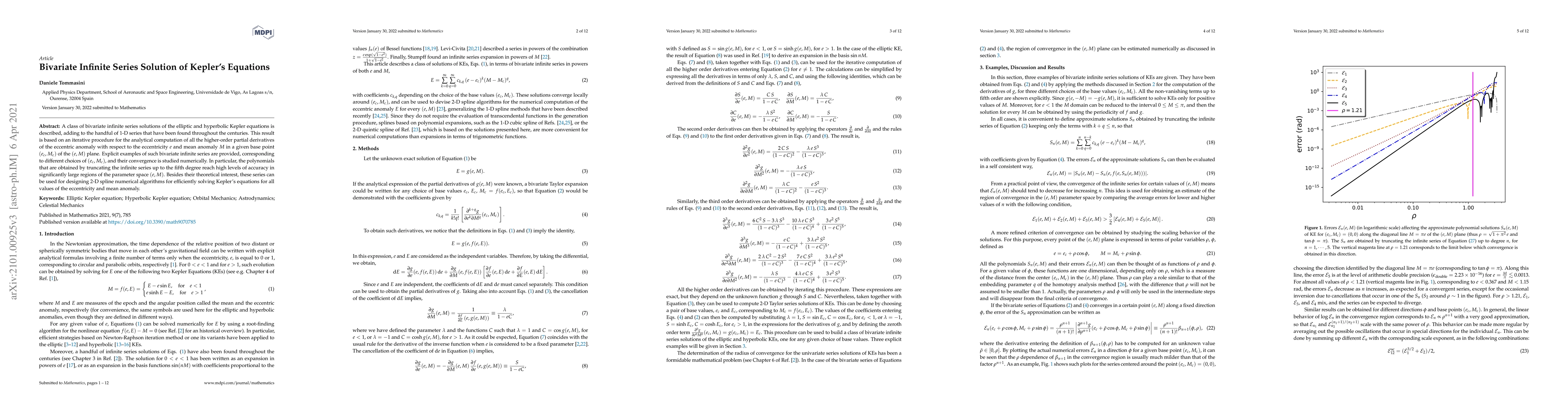 A class of bivariate infinite series solutions of the elliptic and hyperbolic Kepler equations is described, adding to the handful of 1-D series that have been found throughout the centuries. This result is based on an iterative procedure for the analytical computation of all the higher-order partial derivatives of the eccentric anomaly with respect to the eccentricity $e$ and mean anomaly $M$ in a given base point $(e_c,M_c)$ of the $(e,M)$ plane. Explicit examples of such bivariate infinite series are provided, corresponding to different choices of $(e_c,M_c)$, and their convergence is studied numerically. In particular, the polynomials that are obtained by truncating the infinite series up to the fifth degree reach high levels of accuracy in significantly large regions of the parameter space $(e,M)$. Besides their theoretical interest, these series can be used for designing 2-D spline numerical algorithms for efficiently solving Kepler's equations for all values of the eccentricity and mean anomaly.