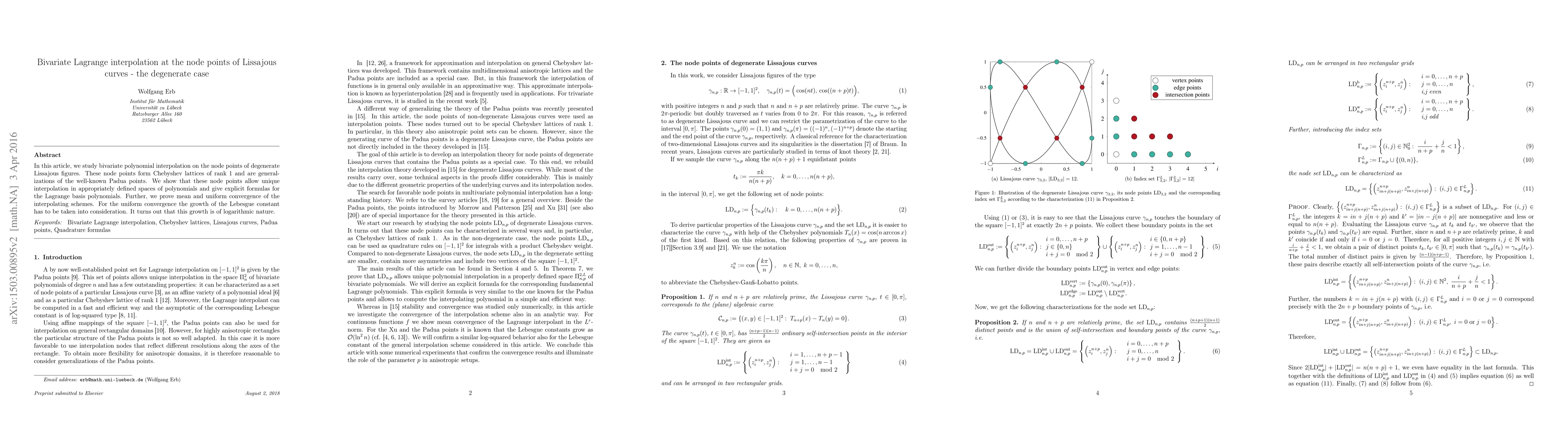In this article, we study bivariate polynomial interpolation on the node points of degenerate Lissajous figures. These node points form Chebyshev lattices of rank $1$ and are generalizations of the well-known Padua points. We show that these node points allow unique interpolation in appropriately defined spaces of polynomials and give explicit formulas for the Lagrange basis polynomials. Further, we prove mean and uniform convergence of the interpolating schemes. For the uniform convergence the growth of the Lebesgue constant has to be taken into consideration. It turns out that this growth is of logarithmic nature.