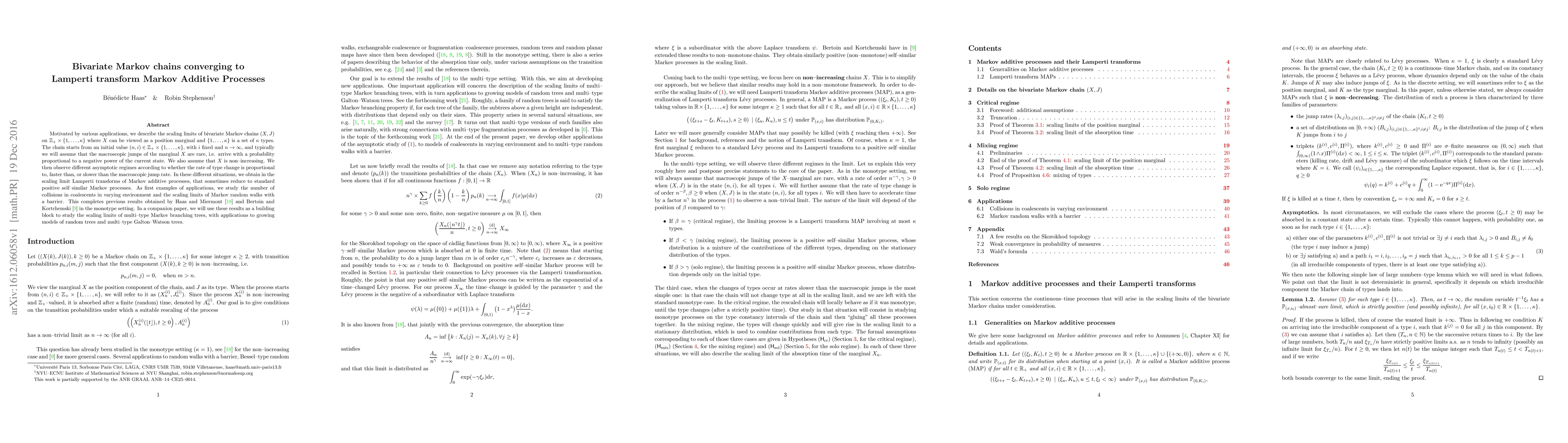 Motivated by various applications, we describe the scaling limits of bivariate Markov chains $(X,J)$ on $\mathbb Z_+ \times \{1,\ldots,\kappa\}$ where $X$ can be viewed as a position marginal and $\{1,\ldots,\kappa\}$ is a set of $\kappa$ types. The chain starts from an initial value $(n,i)\in \mathbb Z_+ \times \{1,\ldots,\kappa\}$, with $i$ fixed and $n \rightarrow \infty$, and typically we will assume that the macroscopic jumps of the marginal $X$ are rare, i.e. arrive with a probability proportional to a negative power of the current state. We also assume that $X$ is non-increasing. We then observe different asymptotic regimes according to whether the rate of type change is proportional to, faster than, or slower than the macroscopic jump rate. In these different situations, we obtain in the scaling limit Lamperti transforms of Markov additive processes, that sometimes reduce to standard positive self-similar Markov processes. As first examples of applications, we study the number of collisions in coalescents in varying environment and the scaling limits of Markov random walks with a barrier. This completes previous results obtained by Haas and Miermont as well as Bertoin and Kortchemski in the monotype setting. In a companion paper, we will use these results as a building block to study the scaling limits of multi-type Markov branching trees, with applications to growing models of random trees and multi-type Galton-Watson trees.