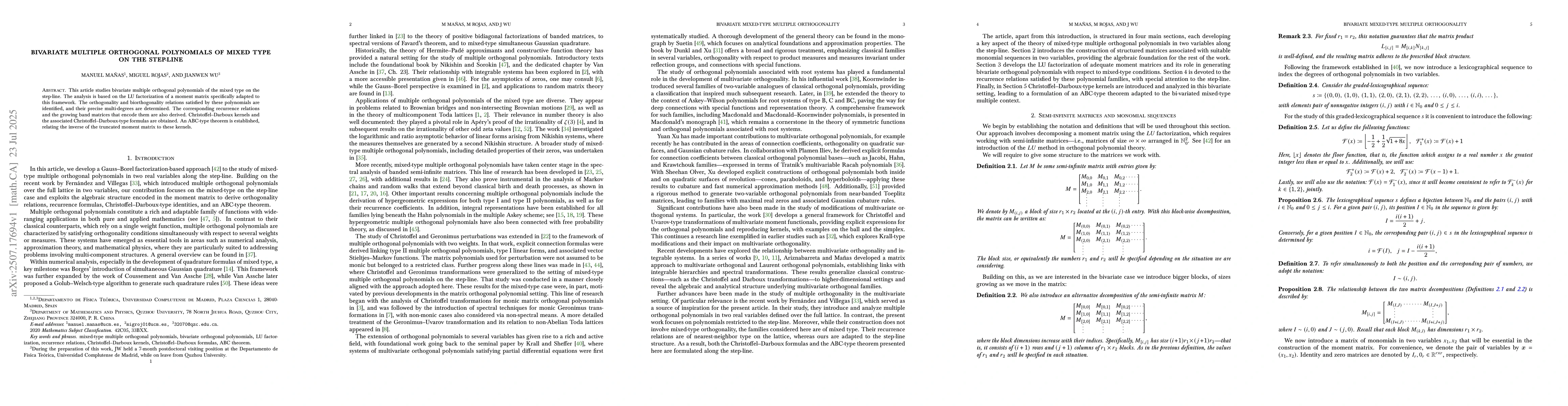 This article studies bivariate multiple orthogonal polynomials of the mixed type on the step-line. The analysis is based on the LU factorization of a moment matrix specifically adapted to this framework. The orthogonality and biorthogonality relations satisfied by these polynomials are identified, and their precise multi-degrees are determined. The corresponding recurrence relations and the growing band matrices that encode them are also derived. Christoffel-Darboux kernels and the associated Christoffel-Darboux-type formulas are obtained. An ABC-type theorem is established, relating the inverse of the truncated moment matrix to these kernels.