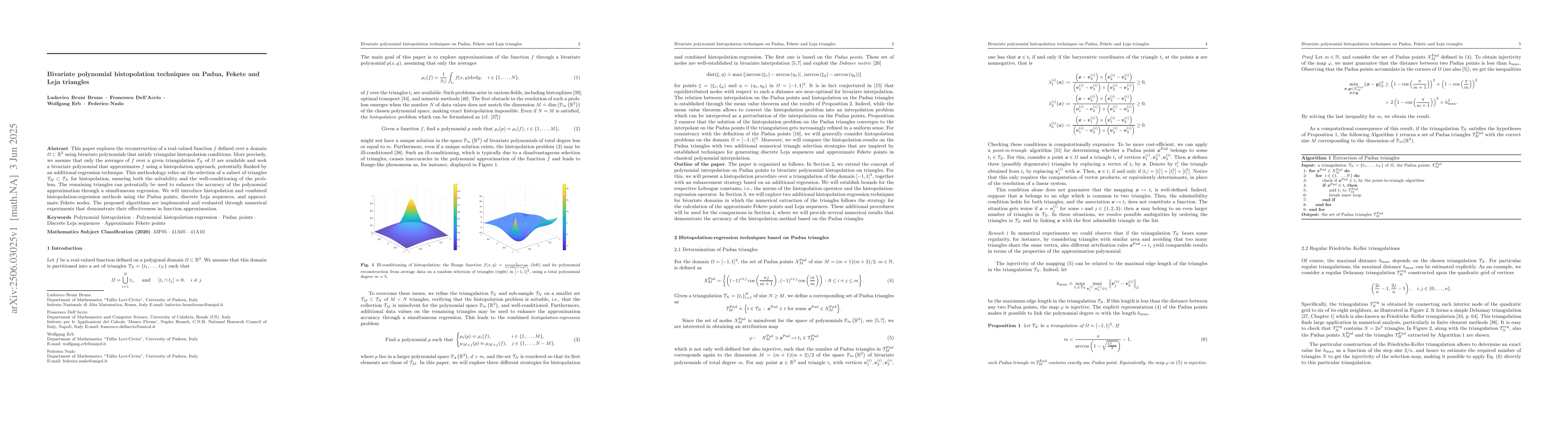 This paper explores the reconstruction of a real-valued function $f$ defined over a domain $\Omega \subset \mathbb{R}^2$ using bivariate polynomials that satisfy triangular histopolation conditions. More precisely, we assume that only the averages of $f$ over a given triangulation $\mathcal{T}_N$ of $\Omega$ are available and seek a bivariate polynomial that approximates $f$ using a histopolation approach, potentially flanked by an additional regression technique. This methodology relies on the selection of a subset of triangles $\mathcal{T}_M \subset \mathcal{T}_N$ for histopolation, ensuring both the solvability and the well-conditioning of the problem. The remaining triangles can potentially be used to enhance the accuracy of the polynomial approximation through a simultaneous regression. We will introduce histopolation and combined histopolation-regression methods using the Padua points, discrete Leja sequences, and approximate Fekete nodes. The proposed algorithms are implemented and evaluated through numerical experiments that demonstrate their effectiveness in function approximation.