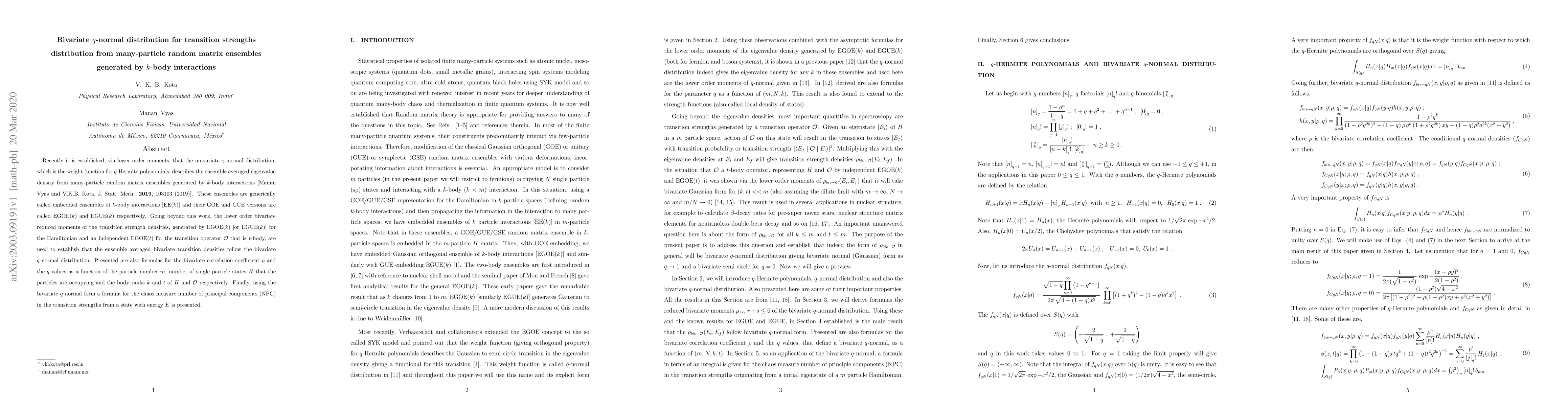 This paper extends the univariate $q$-normal distribution to describe the ensemble averaged bivariate transition strengths in many-particle random matrix ensembles generated by $k$-body interactions. It establishes the bivariate $q$-normal distribution for transition densities and provides formulas for the correlation coefficient and $q$ values, ultimately relating these to the chaos measure number of principal components.