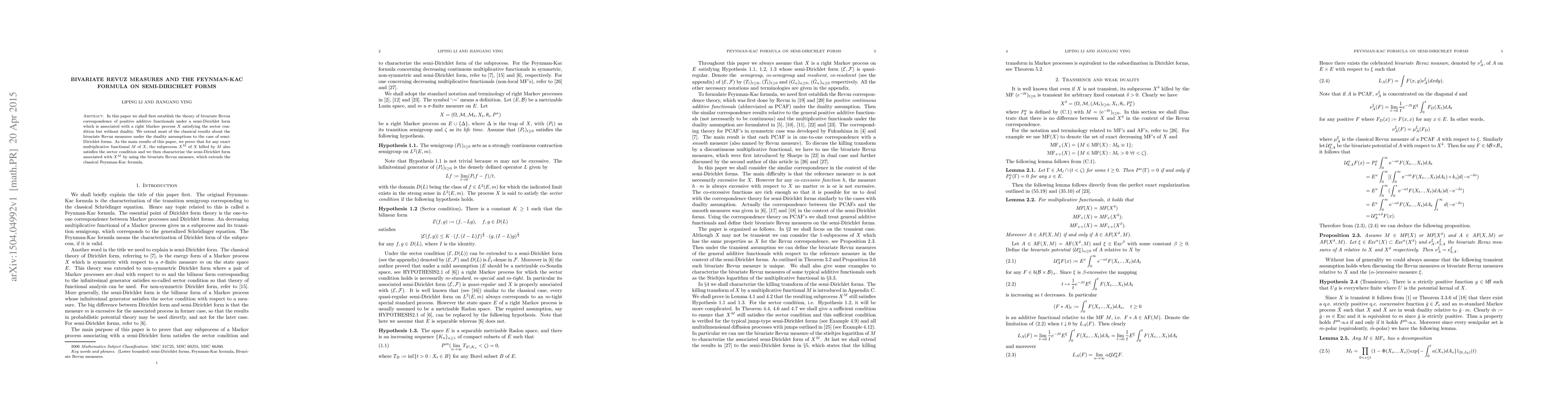 This paper develops the theory of bivariate Revuz measures for positive additive functionals under semi-Dirichlet forms, extending classical results to cases without duality. The main results show that the subprocess of a right Markov process killed by an exact multiplicative functional also satisfies the sector condition, and characterize the semi-Dirichlet form associated with this subprocess using the bivariate Revuz measure, extending the Feynman-Kac formula.