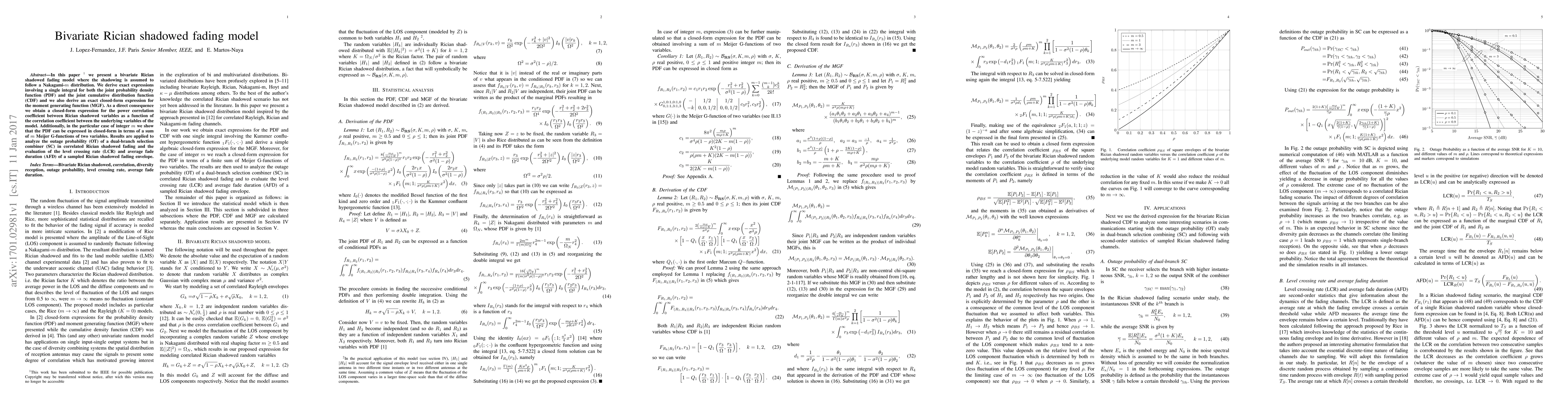 This paper introduces a bivariate Rician shadowed fading model with shadowing following a Nakagami-$m$ distribution, deriving exact expressions for joint PDF, CDF, and MGF. It also provides a closed-form expression for the power correlation coefficient and analyzes outage probability and fade metrics for dual-branch selection combining.
