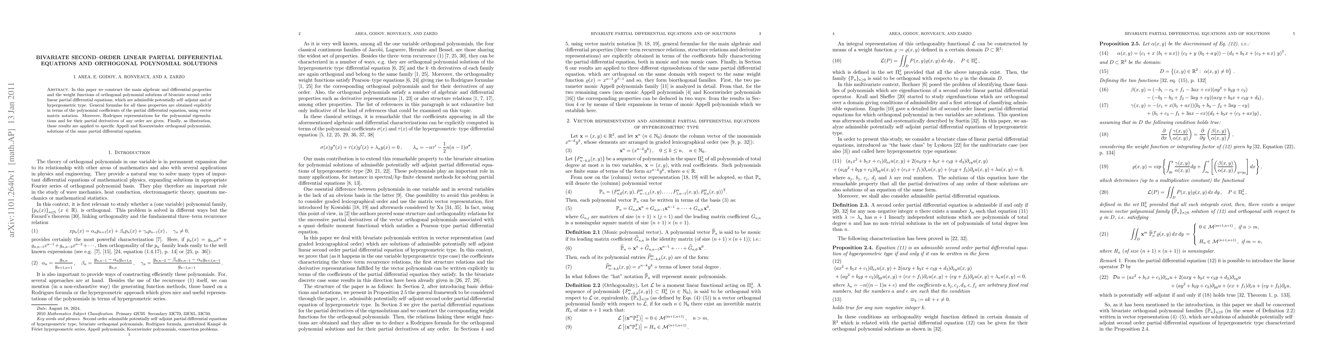 In this paper we construct the main algebraic and differential properties and the weight functions of orthogonal polynomial solutions of bivariate second--order linear partial differential equations, which are admissible potentially self--adjoint and of hypergeometric type. General formulae for all these properties are obtained explicitly in terms of the polynomial coefficients of the partial differential equation, using vector matrix notation. Moreover, Rodrigues representations for the polynomial eigensolutions and for their partial derivatives of any order are given. Finally, as illustration, these results are applied to specific Appell and Koornwinder orthogonal polynomials, solutions of the same partial differential equation.