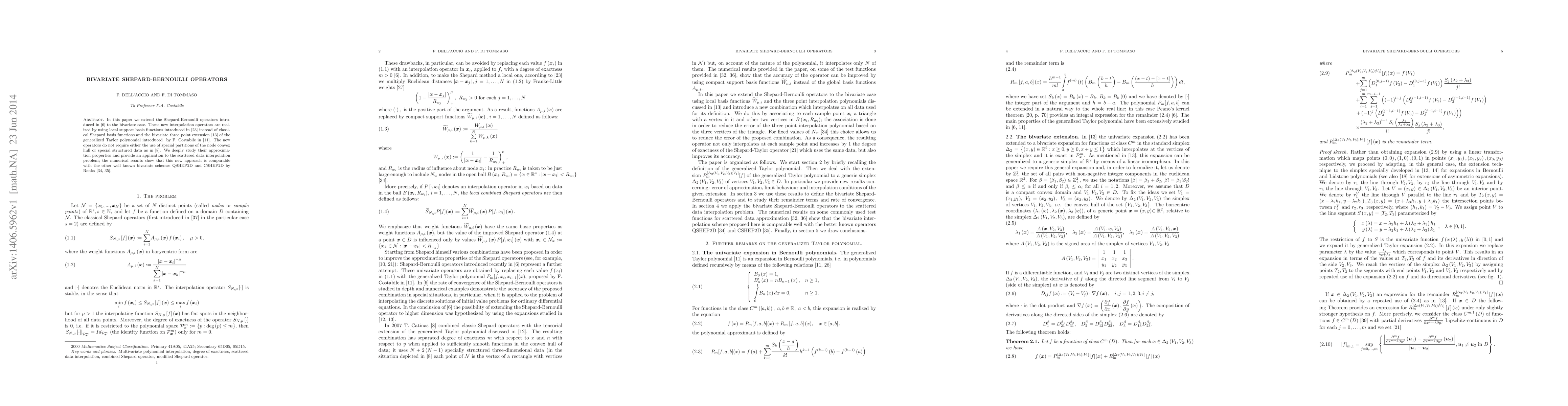 New bivariate interpolation operators (Shepard-Bernoulli) with improved approximation properties and comparable performance to existing schemes for scattered data interpolation, using local support basis functions and a modified three-point extension.