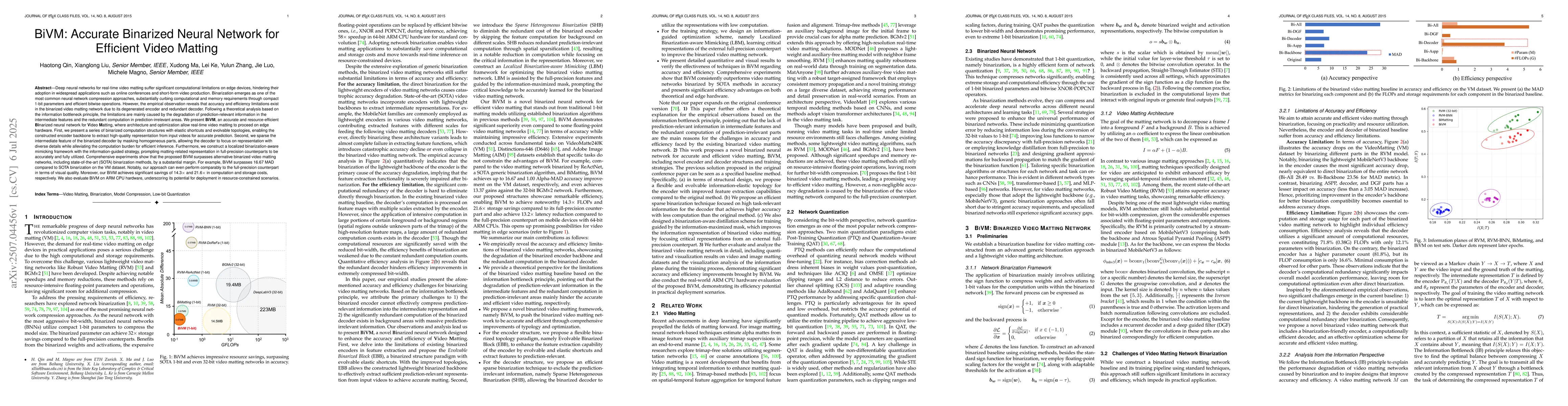 Deep neural networks for real-time video matting suffer significant computational limitations on edge devices, hindering their adoption in widespread applications such as online conferences and short-form video production. Binarization emerges as one of the most common compression approaches with compact 1-bit parameters and efficient bitwise operations. However, accuracy and efficiency limitations exist in the binarized video matting network due to its degenerated encoder and redundant decoder. Following a theoretical analysis based on the information bottleneck principle, the limitations are mainly caused by the degradation of prediction-relevant information in the intermediate features and the redundant computation in prediction-irrelevant areas. We present BiVM, an accurate and resource-efficient Binarized neural network for Video Matting. First, we present a series of binarized computation structures with elastic shortcuts and evolvable topologies, enabling the constructed encoder backbone to extract high-quality representation from input videos for accurate prediction. Second, we sparse the intermediate feature of the binarized decoder by masking homogeneous parts, allowing the decoder to focus on representation with diverse details while alleviating the computation burden for efficient inference. Furthermore, we construct a localized binarization-aware mimicking framework with the information-guided strategy, prompting matting-related representation in full-precision counterparts to be accurately and fully utilized. Comprehensive experiments show that the proposed BiVM surpasses alternative binarized video matting networks, including state-of-the-art (SOTA) binarization methods, by a substantial margin. Moreover, our BiVM achieves significant savings of 14.3x and 21.6x in computation and storage costs, respectively. We also evaluate BiVM on ARM CPU hardware.
