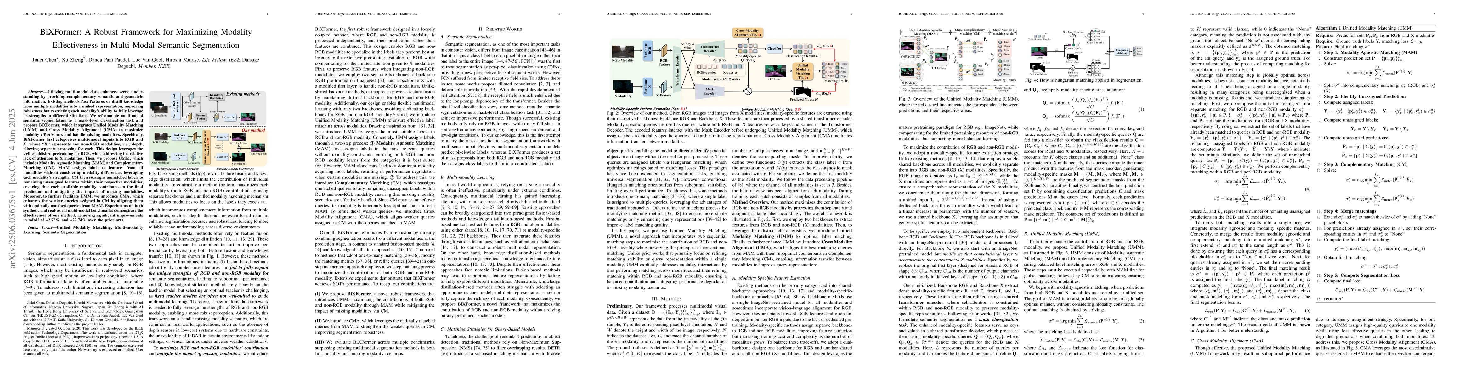 The research proposes BiXFormer, a framework that reformulates multi-modal semantic segmentation as a mask-level classification task. It integrates Unified Modality Matching (UMM) and Cross Modality Alignment (CMA) to maximize modality effectiveness and handle missing modalities. BiXFormer categorizes inputs into RGB and non-RGB modalities, processes them separately, and uses MAM and CM within UMM for feature labeling and reassignment, ensuring each modality contributes to the final prediction.