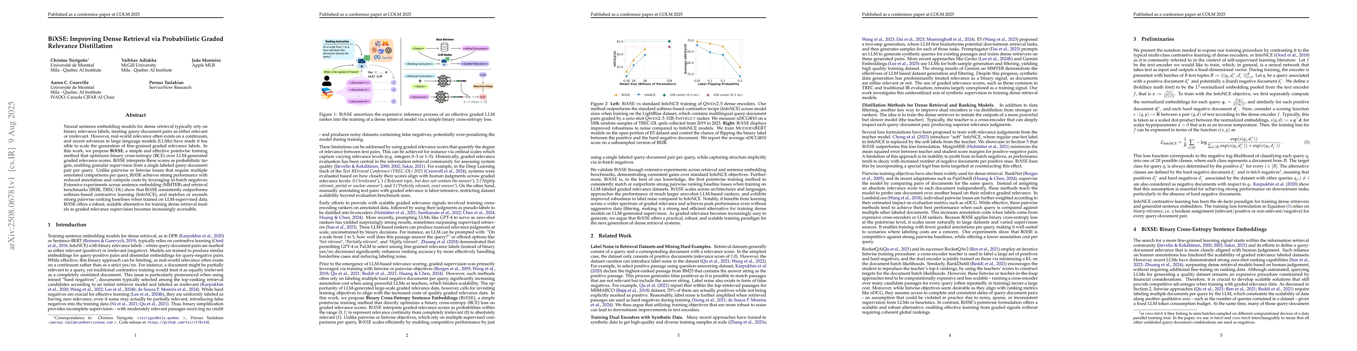 The research proposes BiXSE, a training method for dense retrieval models that optimizes binary cross-entropy (BCE) over LLM-generated graded relevance scores, interpreting these scores as probabilistic targets for granular supervision from single labeled query-document pairs.