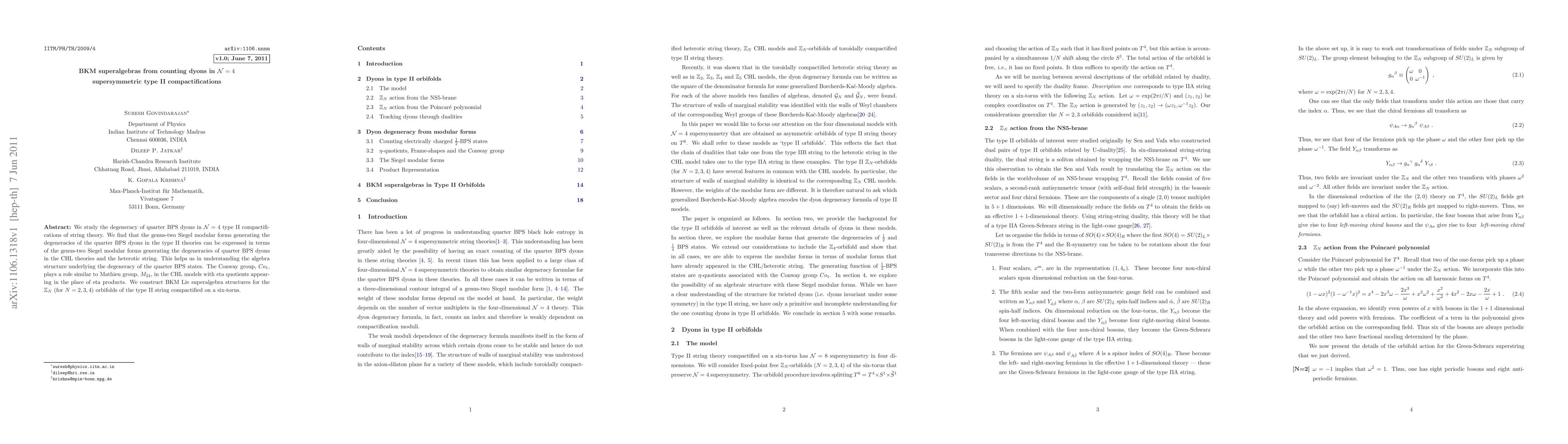 We study the degeneracy of quarter BPS dyons in N =4 type II compactifications of string theory. We find that the genus-two Siegel modular forms generating the degeneracies of the quarter BPS dyons in the type II theories can be expressed in terms of the genus-two Siegel modular forms generating the degeneracies of quarter BPS dyons in the CHL theories and the heterotic string. This helps us in understanding the algebra structure underlying the degeneracy of the quarter BPS states. The Conway group, Co_1, plays a role similar to Mathieu group, M_{24}, in the CHL models with eta quotients appearing in the place of eta products. We construct BKM Lie superalgebra structures corresponding to Z_N (for N=2,3,4) orbifolds of the type II string compactified on a six-torus.