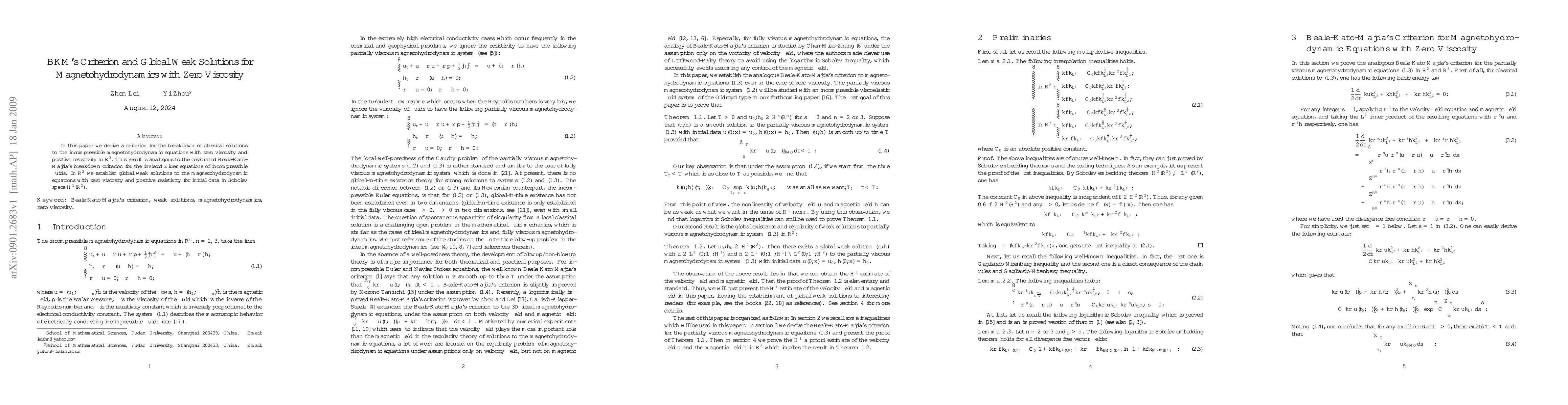 This paper introduces a criterion for the breakdown of classical solutions to zero-viscosity magnetohydrodynamic equations, analogous to the Beale-Kato-Majda criterion for inviscid Euler equations. It also establishes global weak solutions in $\mathbb{R}^2$ for initial data in $H^1(\mathbb{R}^2)$.
