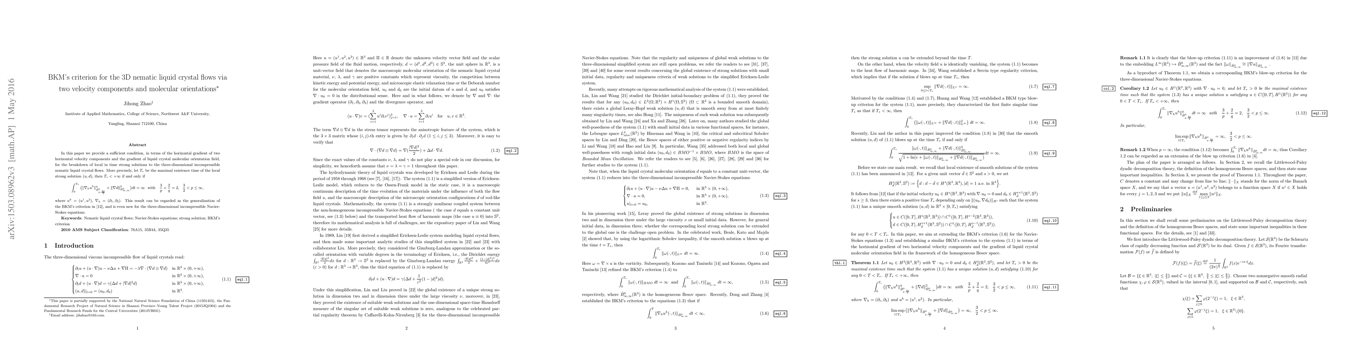 A new criterion for the breakdown of nematic liquid crystal flows is established in terms of horizontal velocity components and molecular orientation gradients, extending previous work on 2D Navier-Stokes equations.