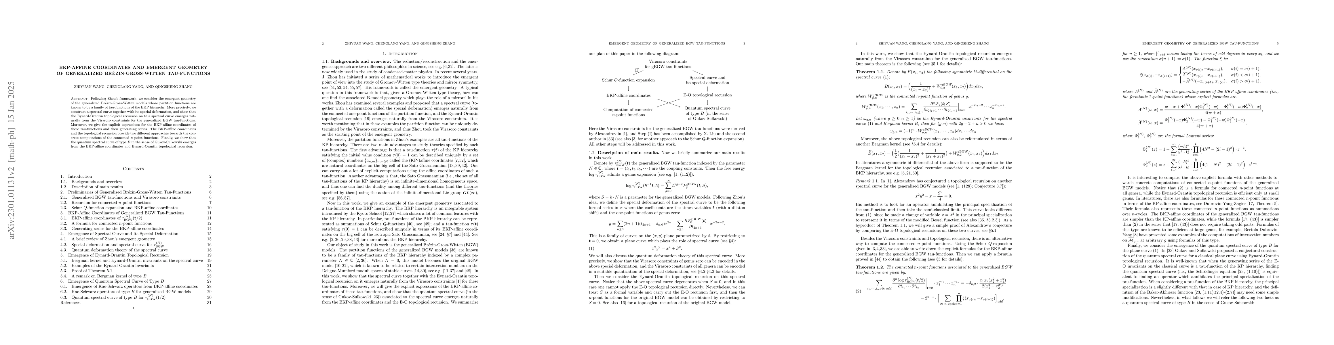 Following Zhou's framework, we consider the emergent geometry of the generalized Br\'ezin-Gross-Witten models whose partition functions are known to be a family of tau-functions of the BKP hierarchy. More precisely, we construct a spectral curve together with its special deformation, and show that the Eynard-Orantin topological recursion on this spectral curve emerges naturally from the Virasoro constraints for the generalized BGW tau-functions. Moreover, we give the explicit expressions for the BKP-affine coordinates of these tau-functions and their generating series. The BKP-affine coordinates and the topological recursion provide two different approaches towards the concrete computations of the connected $n$-point functions. Finally, we show that the quantum spectral curve of type $B$ in the sense of Gukov-Su{\l}kowski emerges from the BKP-affine coordinates and Eynard-Orantin topological recursion.