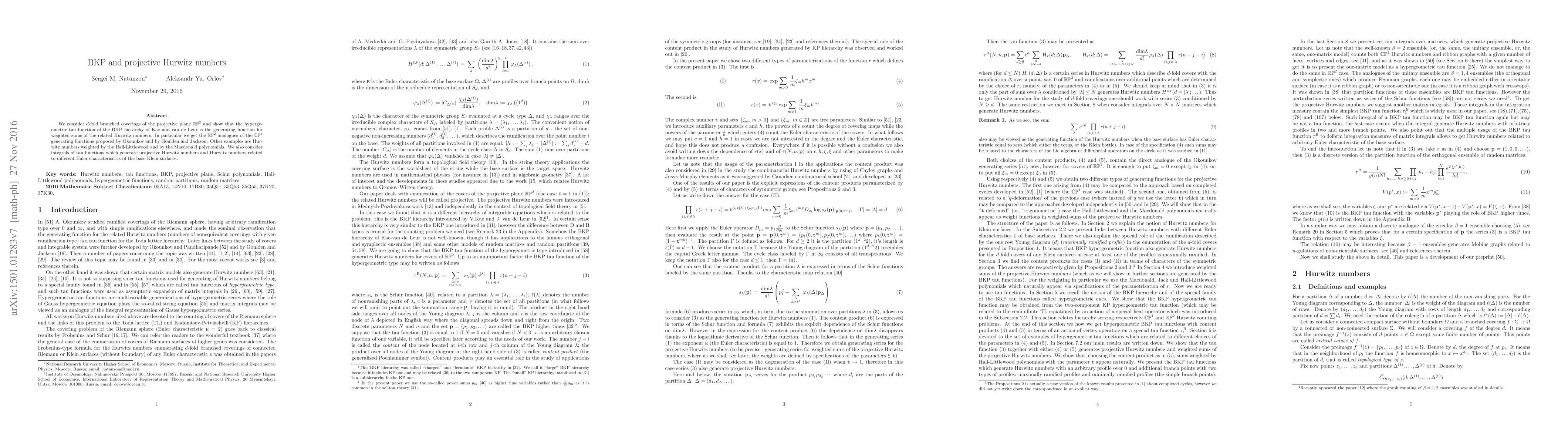 The research employs the BKP hierarchy of integrable equations to study d-fold branched coverings of the projective plane $\mathbb{RP}^2$, linking hypergeometric tau functions to weighted sums of related Hurwitz numbers.