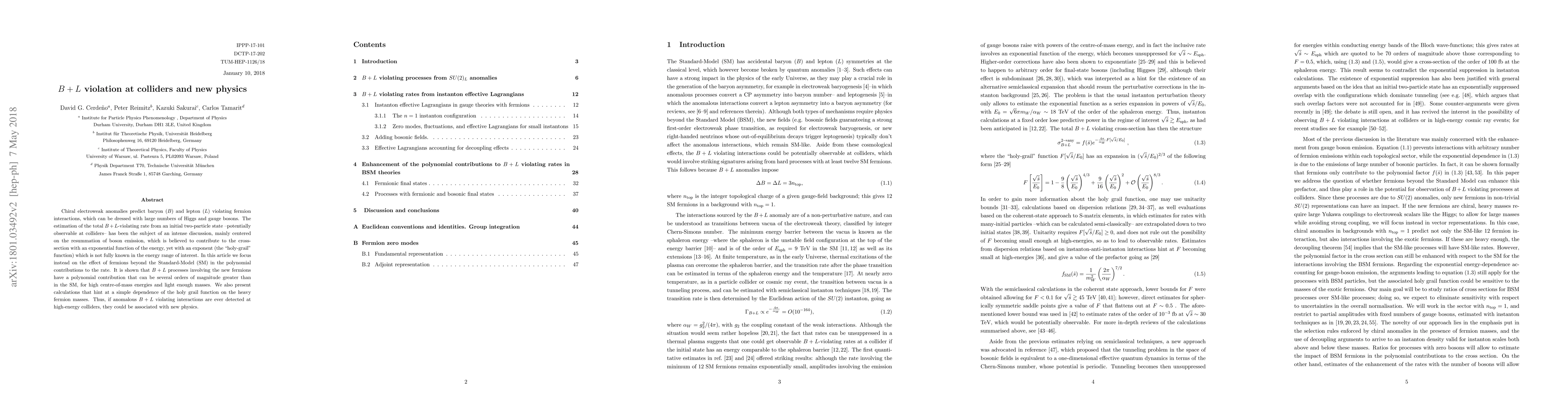 Chiral electroweak anomalies predict fermion interactions that violate baryon ($B$) and lepton number ($L$), and can be dressed with large numbers of Higgs and gauge bosons. The estimation of the total $B+L$ violating rate from an initial two-particle state --potentially observable at colliders-- has been the subject of an intense discussion, mainly centered on the resummation of boson emission, which is believed to contribute to the cross-section with an exponential function of the energy, yet with an exponent (the "holy-grail" function) which is not fully known in the energy range of interest. In this article we focus instead on the effect of fermions beyond the Standard-Model (SM) in the polynomial contributions to the rate. It is shown that $B+L$ processes involving the new fermions have a polynomial contribution that can be several orders of magnitude greater than in the SM, for high centre-of-mass energies and light enough masses. We also present calculations that hint at a simple dependence of the holy grail function on the heavy fermion masses. Thus, if anomalous $B+L$ violating interactions are ever detected at high-energy colliders, they could be associated with new physics.