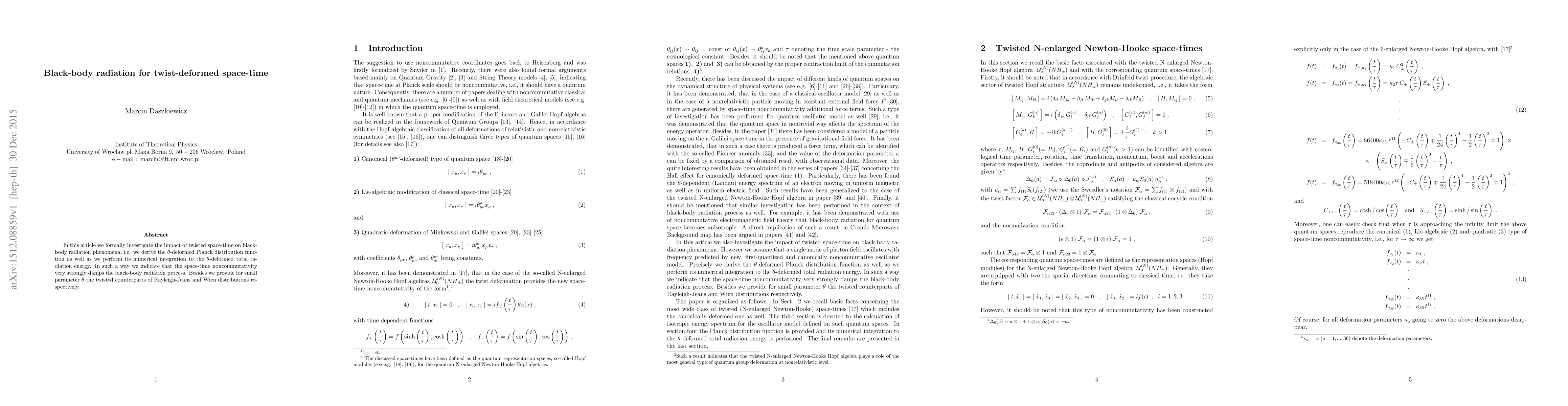 In this article we formally investigate the impact of twisted space-time on black-body radiation phenomena, i.e. we derive the $\theta$-deformed Planck distribution function as well as we perform its numerical integration to the $\theta$-deformed total radiation energy. In such a way we indicate that the space-time noncommutativity very strongly damps the black-body radiation process. Besides we provide for small parameter $\theta$ the twisted counterparts of Rayleigh-Jeans and Wien distributions respectively.