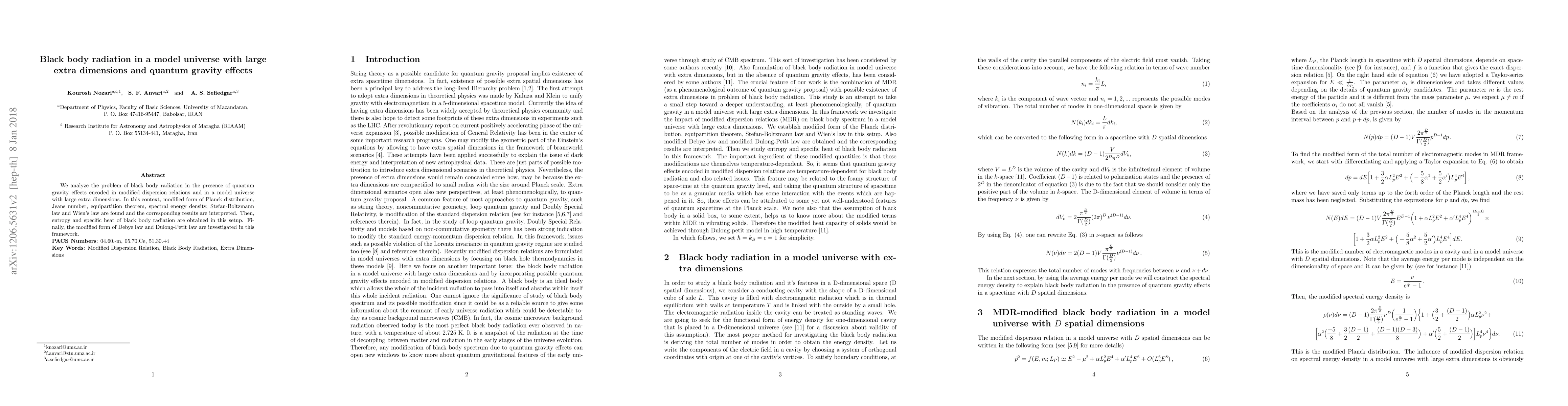 We analyze the problem of black body radiation in the presence of quantum gravity effects encoded in modified dispersion relations and in a model universe with large extra dimensions. In this context, modified form of Planck distribution, Jeans number, equipartition theorem, spectral energy density, Stefan-Boltzmann law and Wien's law are found and the corresponding results are interpreted. Then, entropy and specific heat of black body radiation are obtained in this setup. Finally, the modified form of Debye law and Dulong-Petit law are investigated in this framework.