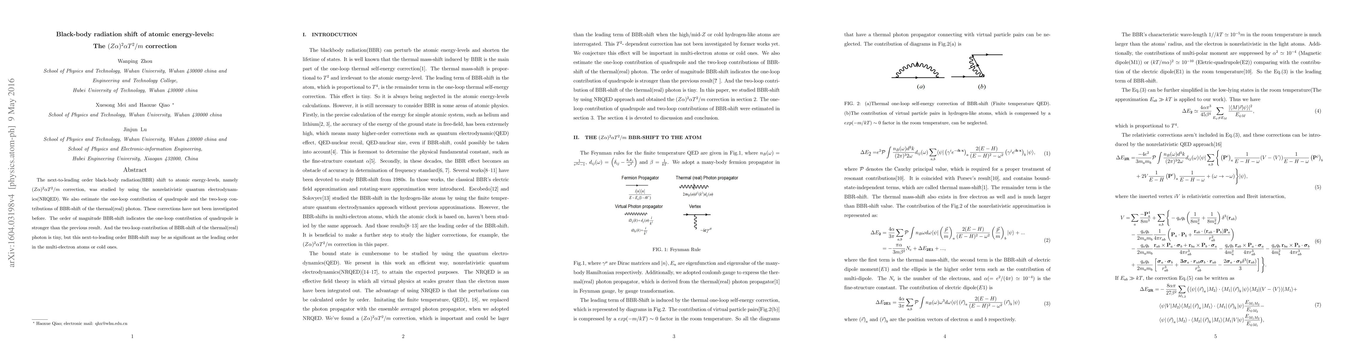 The next-to-leading order black-body radiation(BBR) shift to atomic energy-levels, namely $ (Z\alpha)^2\alpha T^2/m $ correction, was studied by using the nonrelativistic quantum electrodynamics(NRQED). We also estimate the one-loop contribution of quadrupole and the two-loop contributions of BBR-shift of the thermal(real) photon. These corrections have not been investigated before. The order of magnitude BBR-shift indicates the one-loop contribution of quadrupole is stronger than the previous result. And the two-loop contribution of BBR-shift of the thermal(real) photon is tiny, but this next-to-leading order BBR-shift may be as significant as the leading order in the multi-electron atoms or cold ones.