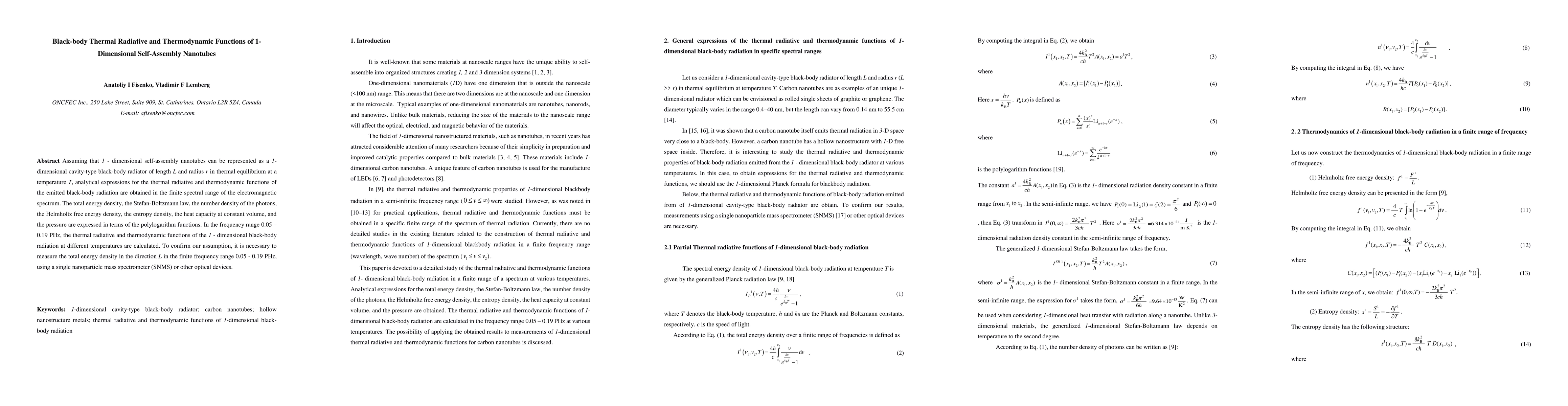 Researchers developed analytical expressions for thermal radiative and thermodynamic functions of 1-dimensional self-assembly nanotubes, calculating key properties like energy density and heat capacity at different temperatures.