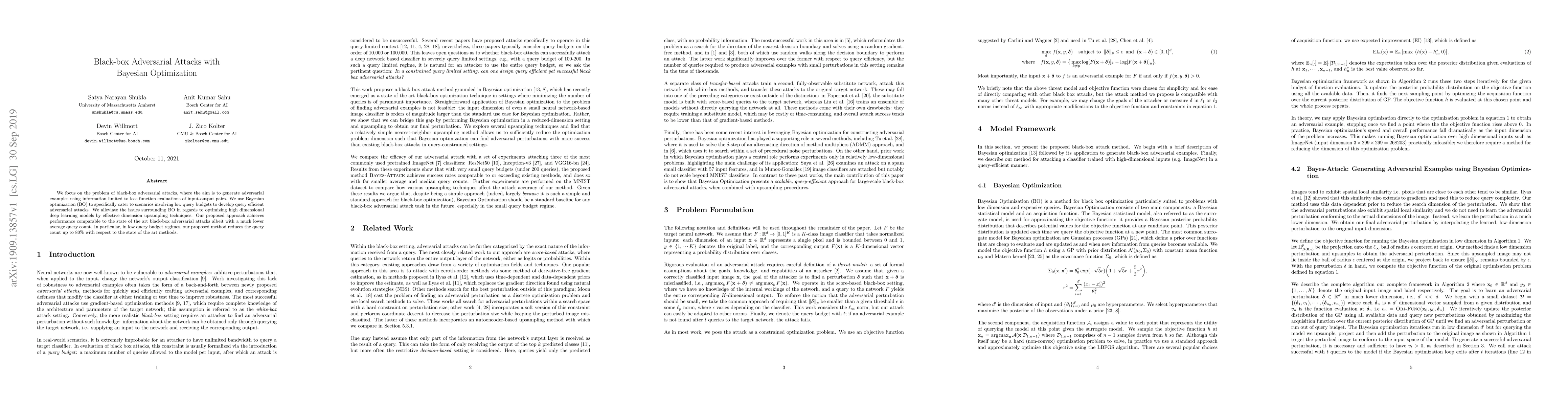 This paper proposes a Bayesian optimization method for black-box adversarial attacks, achieving comparable performance to state-of-the-art techniques while significantly reducing the average query count, especially in low query budget scenarios, by up to 80%. Dimension upsampling techniques are used to address high-dimensional optimization challenges.