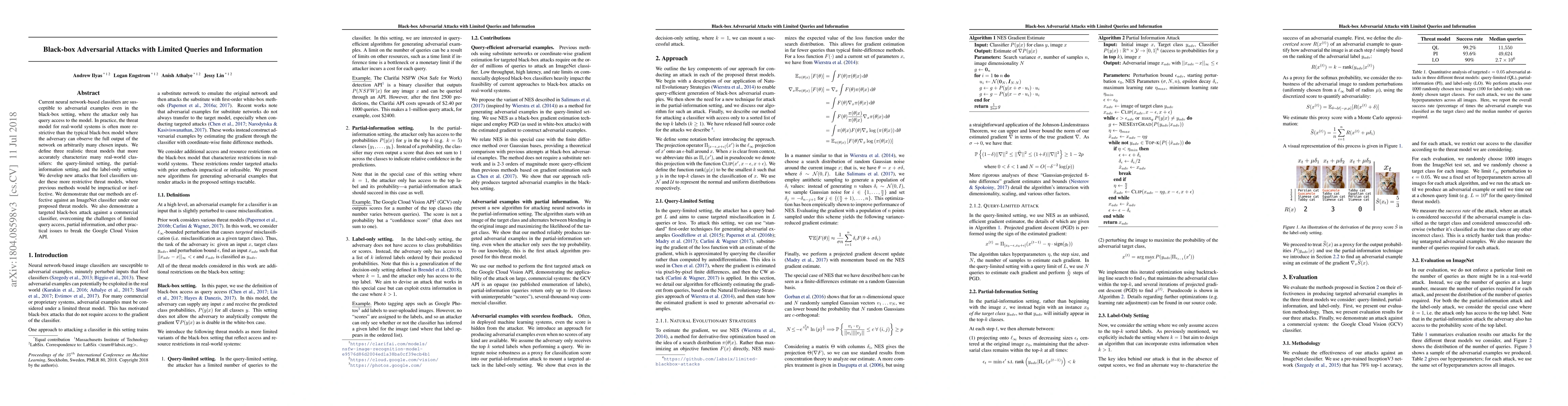 This paper introduces new adversarial attack methods for black-box neural network classifiers under realistic threat models with limited queries and partial information. The authors propose effective attacks for query-limited, partial-information, and label-only settings, demonstrating their success against an ImageNet classifier and a commercial Google Cloud Vision API.