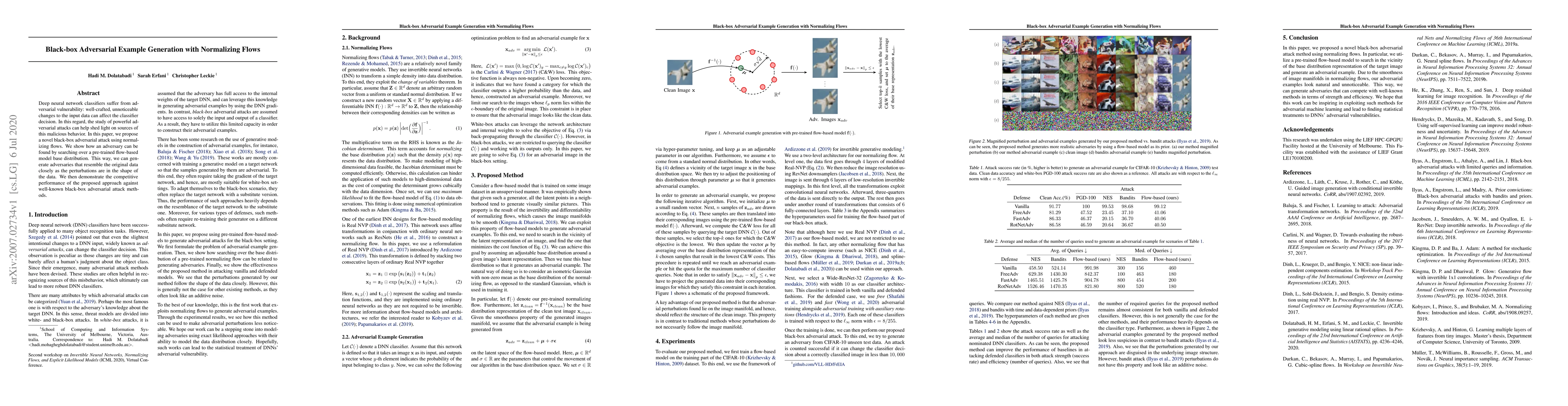 This paper proposes a novel black-box adversarial attack method using normalizing flows to generate adversarial examples that closely resemble the original data. The approach demonstrates competitive performance against established black-box attack methods.