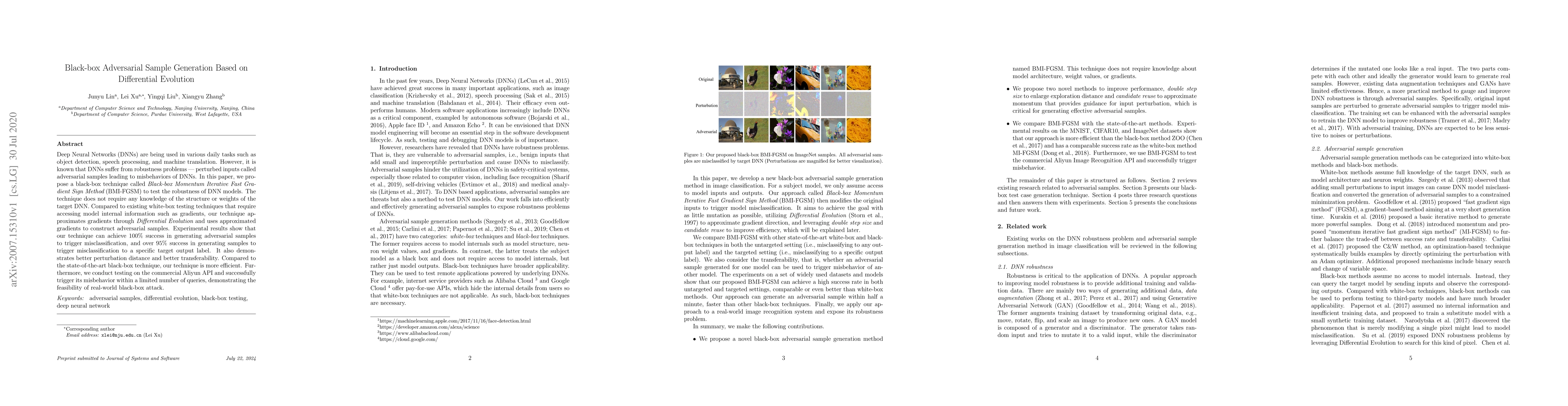 A new black-box technique called BMI-FGSM generates adversarial samples to test DNN robustness without accessing internal model information, achieving 100% success in triggering misclassification and demonstrating better perturbation distance and transferability.