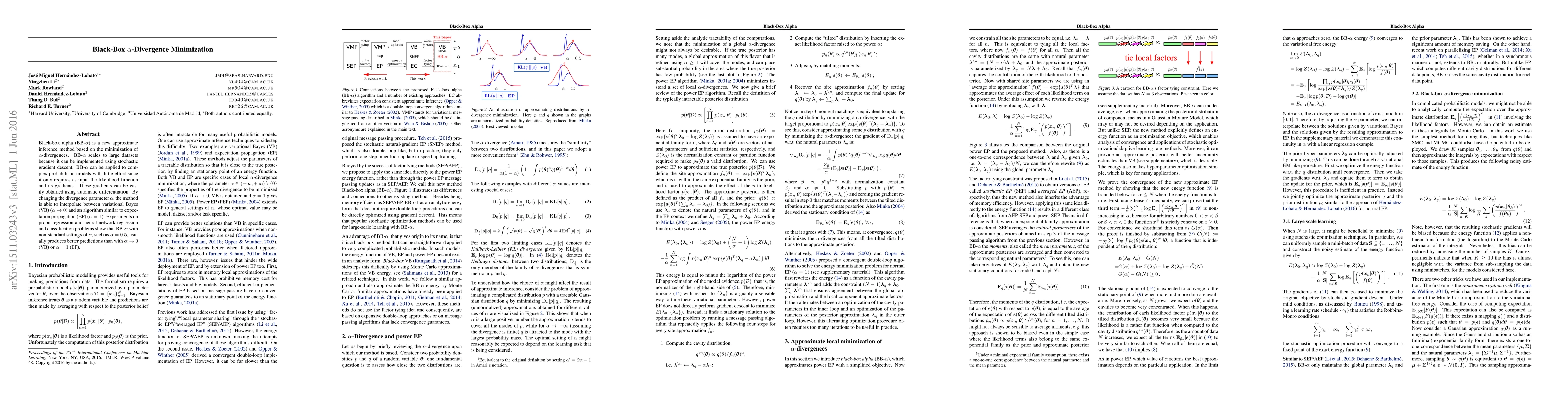 Black-box alpha ($\alpha$) minimization is a scalable approximate inference method that leverages stochastic gradient descent and automatic differentiation to optimize $\alpha$-divergences. It interpolates between variational Bayes and expectation propagation, often yielding better predictions with non-standard $\alpha$ values like $\alpha = 0.5$.