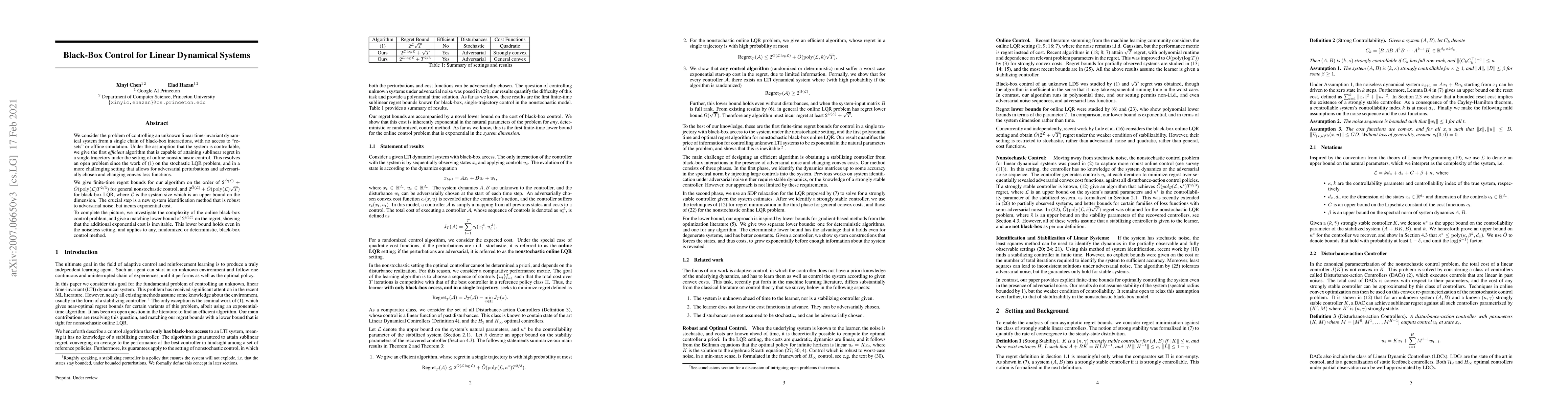 We consider the problem of controlling an unknown linear time-invariant dynamical system from a single chain of black-box interactions, with no access to resets or offline simulation. Under the assumption that the system is controllable, we give the first efficient algorithm that is capable of attaining sublinear regret in a single trajectory under the setting of online nonstochastic control. This resolves an open problem on the stochastic LQR problem, and in a more challenging setting that allows for adversarial perturbations and adversarially chosen and changing convex loss functions. We give finite-time regret bounds for our algorithm on the order of $2^{\tilde{O}(\mathcal{L})} + \tilde{O}(\text{poly}(\mathcal{L}) T^{2/3})$ for general nonstochastic control, and $2^{\tilde{O}(\mathcal{L})} + \tilde{O}(\text{poly}(\mathcal{L}) \sqrt{T})$ for black-box LQR, where $\mathcal{L}$ is the system size which is an upper bound on the dimension. The crucial step is a new system identification method that is robust to adversarial noise, but incurs exponential cost. To complete the picture, we investigate the complexity of the online black-box control problem, and give a matching lower bound of $2^{\Omega(\mathcal{L})}$ on the regret, showing that the additional exponential cost is inevitable. This lower bound holds even in the noiseless setting, and applies to any, randomized or deterministic, black-box control method.