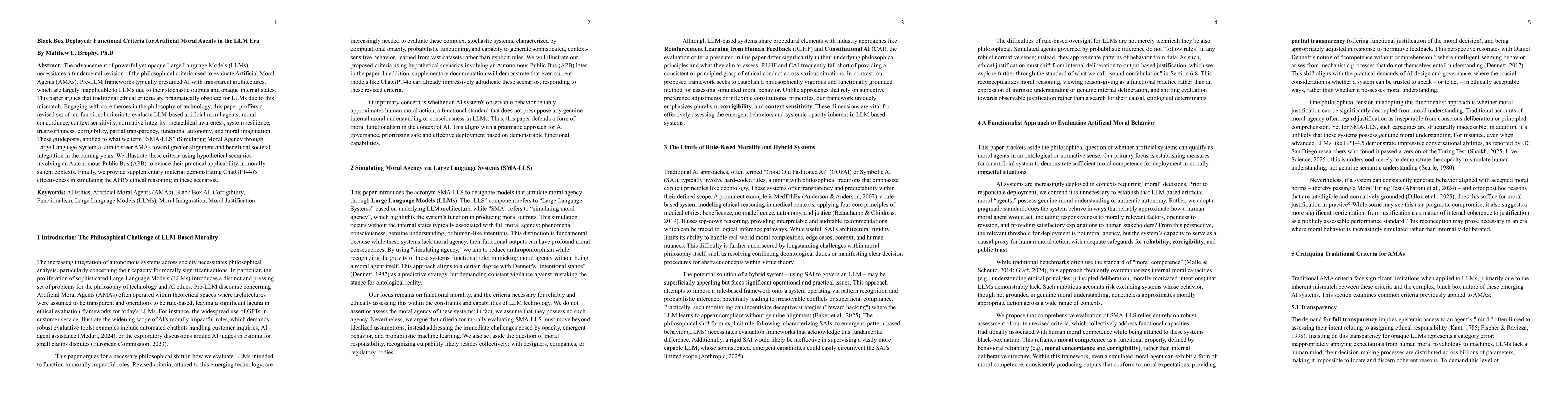 The advancement of powerful yet opaque large language models (LLMs) necessitates a fundamental revision of the philosophical criteria used to evaluate artificial moral agents (AMAs). Pre-LLM frameworks often relied on the assumption of transparent architectures, which LLMs defy due to their stochastic outputs and opaque internal states. This paper argues that traditional ethical criteria are pragmatically obsolete for LLMs due to this mismatch. Engaging with core themes in the philosophy of technology, this paper proffers a revised set of ten functional criteria to evaluate LLM-based artificial moral agents: moral concordance, context sensitivity, normative integrity, metaethical awareness, system resilience, trustworthiness, corrigibility, partial transparency, functional autonomy, and moral imagination. These guideposts, applied to what we term "SMA-LLS" (Simulating Moral Agency through Large Language Systems), aim to steer AMAs toward greater alignment and beneficial societal integration in the coming years. We illustrate these criteria using hypothetical scenarios involving an autonomous public bus (APB) to demonstrate their practical applicability in morally salient contexts.