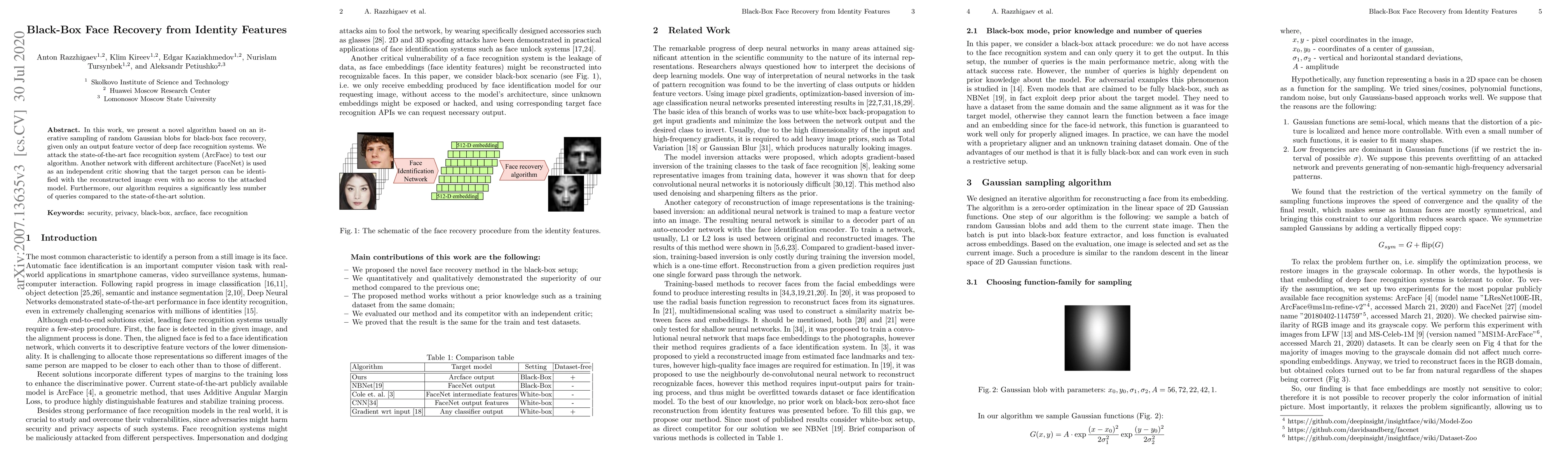 In this work, we present a novel algorithm based on an it-erative sampling of random Gaussian blobs for black-box face recovery, given only an output feature vector of deep face recognition systems. We attack the state-of-the-art face recognition system (ArcFace) to test our algorithm. Another network with different architecture (FaceNet) is used as an independent critic showing that the target person can be identified with the reconstructed image even with no access to the attacked model. Furthermore, our algorithm requires a significantly less number of queries compared to the state-of-the-art solution.