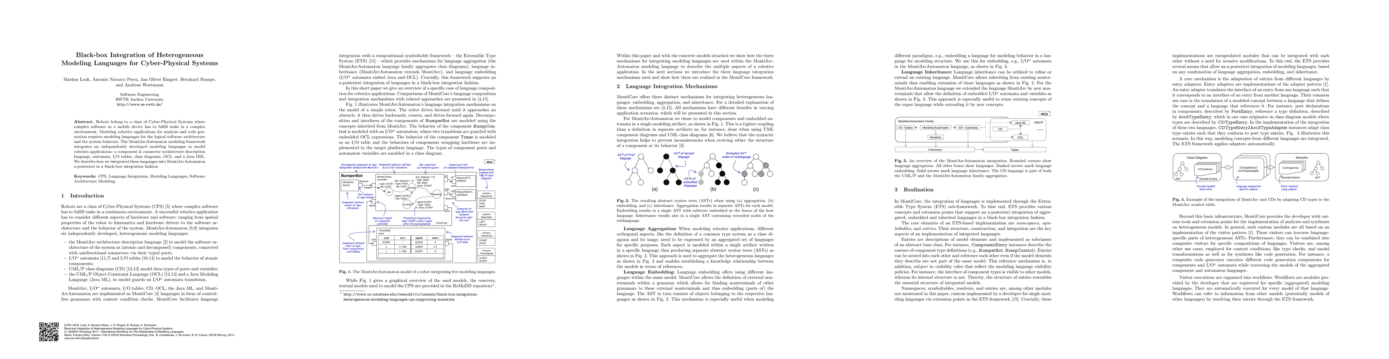 Robots belong to a class of Cyber-Physical Systems where complex software as a mobile device has to full tasks in a complex environment. Modeling robotics applications for analysis and code generation requires modeling languages for the logical software architecture and the system behavior. The MontiArcAutomaton modeling framework integrates six independently developed modeling languages to model robotics applications: a component & connector architecture description language, automata, I/O tables, class diagrams, OCL, and a Java DSL. We describe how we integrated these languages into MontiArcAutomaton a-posteriori in a black-box integration fashion.