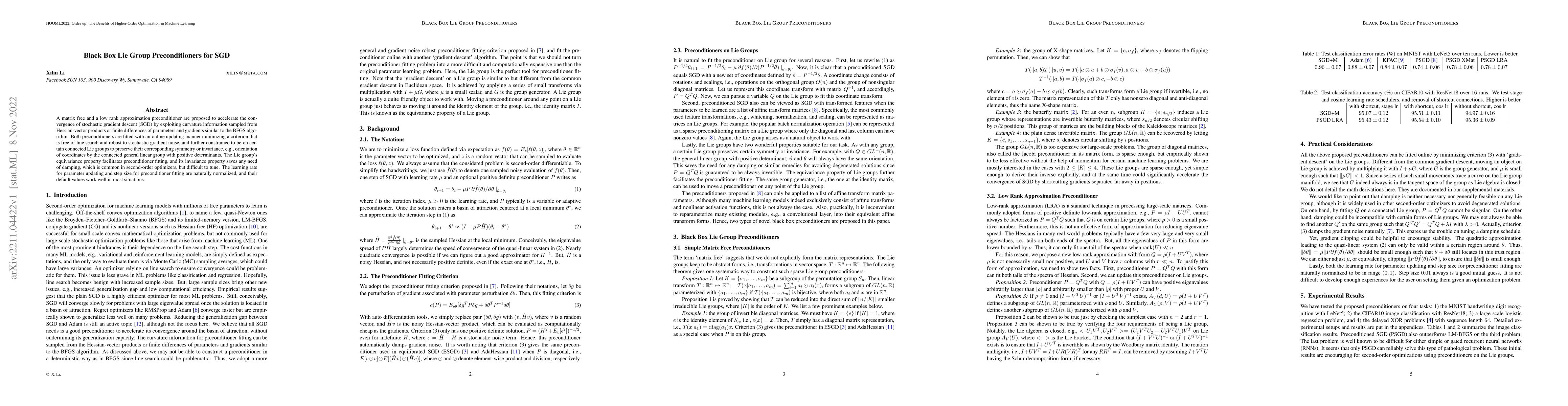 A matrix free and a low rank approximation preconditioner are proposed to accelerate the convergence of stochastic gradient descent (SGD) by exploiting curvature information sampled from Hessian-vector products or finite differences of parameters and gradients similar to the BFGS algorithm. Both preconditioners are fitted with an online updating manner minimizing a criterion that is free of line search and robust to stochastic gradient noise, and further constrained to be on certain connected Lie groups to preserve their corresponding symmetry or invariance, e.g., orientation of coordinates by the connected general linear group with positive determinants. The Lie group's equivariance property facilitates preconditioner fitting, and its invariance property saves any need of damping, which is common in second-order optimizers, but difficult to tune. The learning rate for parameter updating and step size for preconditioner fitting are naturally normalized, and their default values work well in most situations.