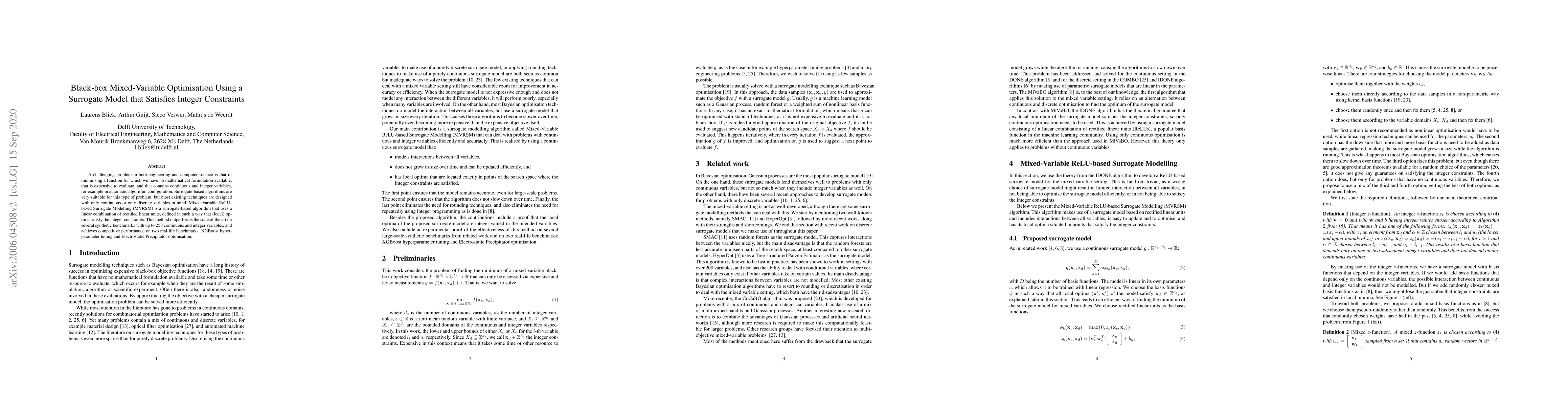 A challenging problem in both engineering and computer science is that of minimising a function for which we have no mathematical formulation available, that is expensive to evaluate, and that contains continuous and integer variables, for example in automatic algorithm configuration. Surrogate-based algorithms are very suitable for this type of problem, but most existing techniques are designed with only continuous or only discrete variables in mind. Mixed-Variable ReLU-based Surrogate Modelling (MVRSM) is a surrogate-based algorithm that uses a linear combination of rectified linear units, defined in such a way that (local) optima satisfy the integer constraints. This method outperforms the state of the art on several synthetic benchmarks with up to 238 continuous and integer variables, and achieves competitive performance on two real-life benchmarks: XGBoost hyperparameter tuning and Electrostatic Precipitator optimisation.