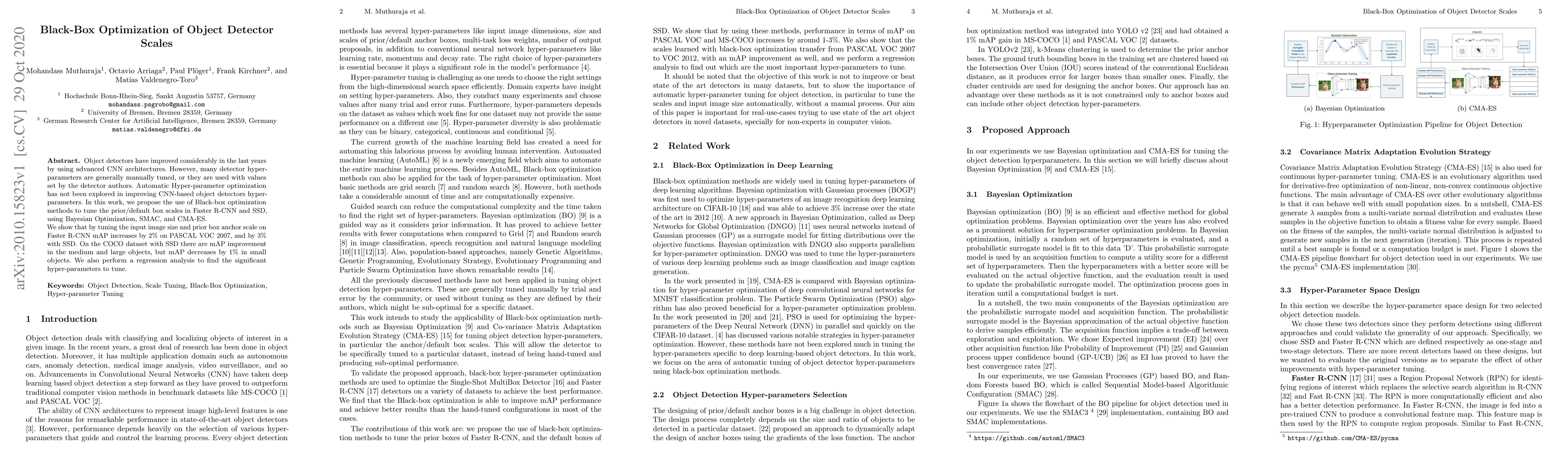 Object detectors have improved considerably in the last years by using advanced CNN architectures. However, many detector hyper-parameters are generally manually tuned, or they are used with values set by the detector authors. Automatic Hyper-parameter optimization has not been explored in improving CNN-based object detectors hyper-parameters. In this work, we propose the use of Black-box optimization methods to tune the prior/default box scales in Faster R-CNN and SSD, using Bayesian Optimization, SMAC, and CMA-ES. We show that by tuning the input image size and prior box anchor scale on Faster R-CNN mAP increases by 2% on PASCAL VOC 2007, and by 3% with SSD. On the COCO dataset with SSD there are mAP improvement in the medium and large objects, but mAP decreases by 1% in small objects. We also perform a regression analysis to find the significant hyper-parameters to tune.